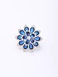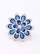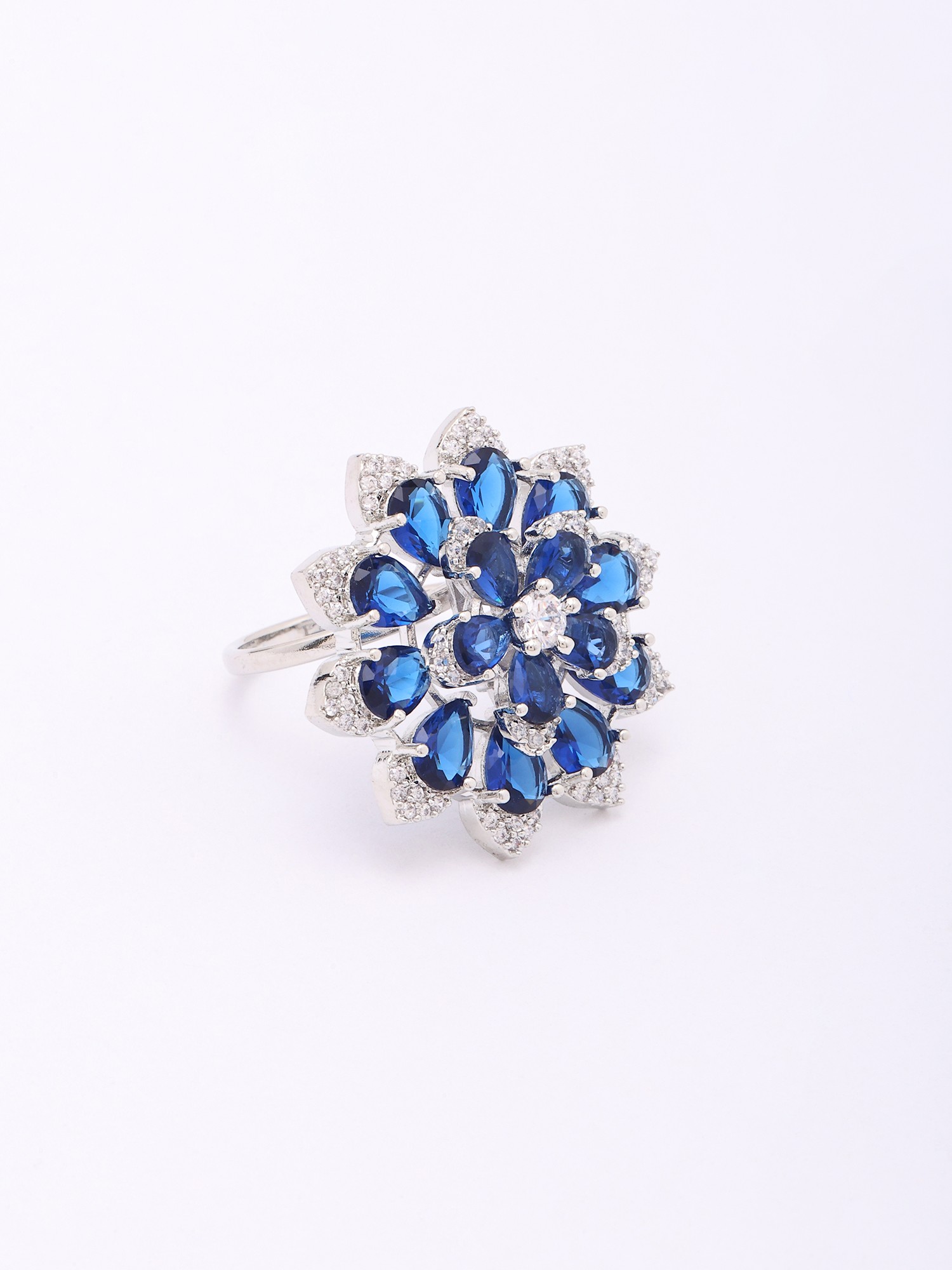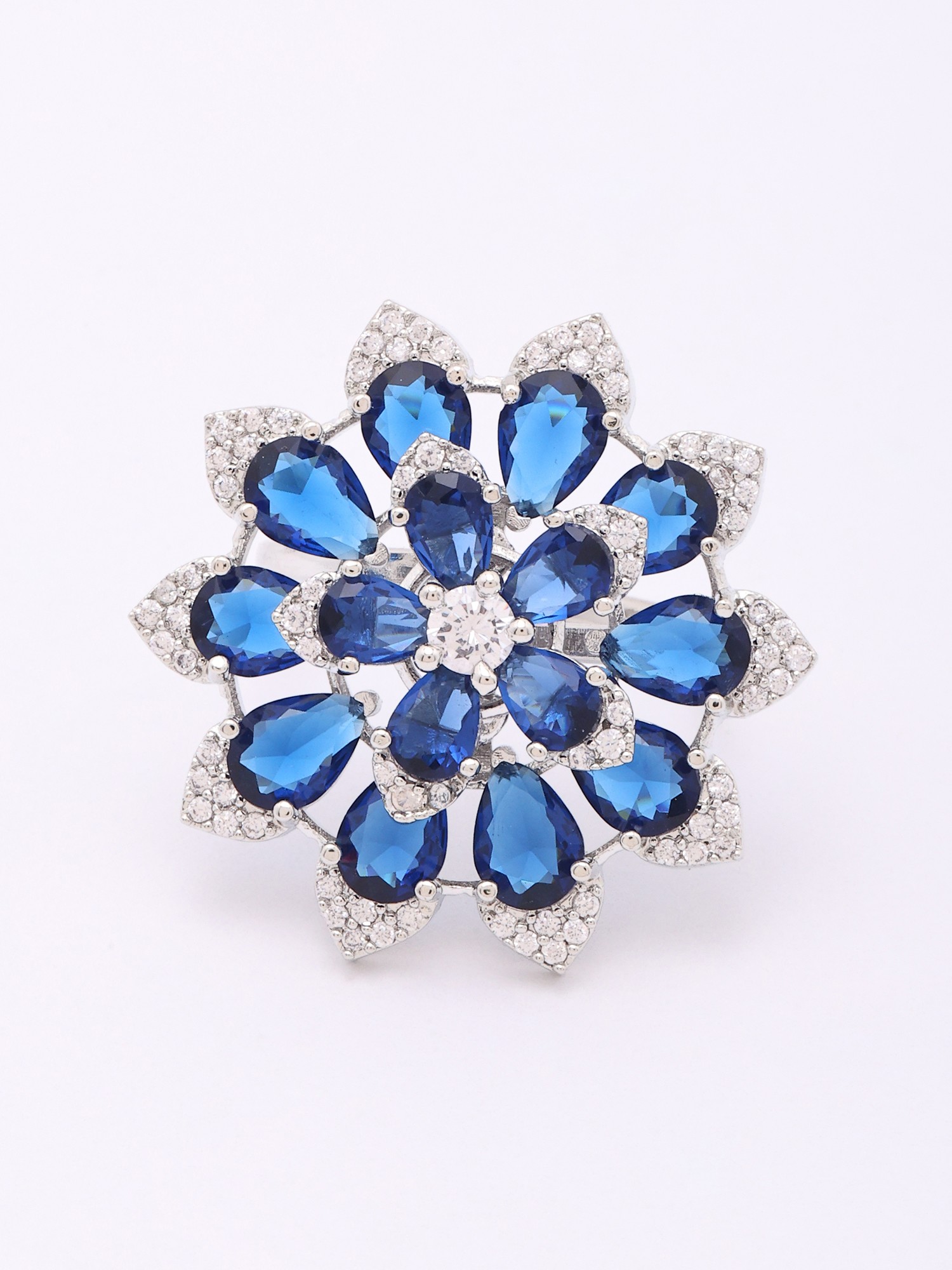 The design unfolds like a mesmerizing bloom, featuring gracefully sculpted petals that encircle a central cluster of shimmering accents. Pear-shaped, sapphire-blue stones are artfully arranged, their facets catching and refracting light with every movement, creating a dazzling display. Complementing these are smaller, clear American diamonds that add an extra layer of sparkle, enhancing the overall brilliance and sophistication. The substantial yet comfortable presence, measuring approximately 1.1 inches in height and 1.2 inches in width, makes it a striking focal point.