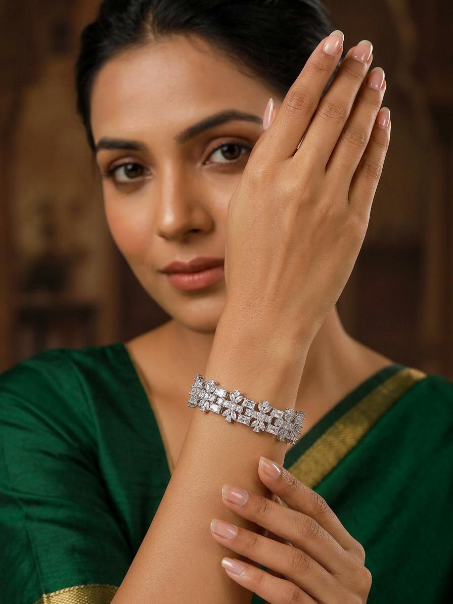 The captivating design features a rich tapestry of precisely cut American diamonds, arranged to create a breathtaking floral motif. Measuring a refined 0.5 inches in width, it gracefully encircles the wrist for a comfortable and flattering fit, extending to a versatile 7.5 inches in length. You'll notice how the interplay of baguette and round-cut stones creates a mesmerizing dance of light with every movement.