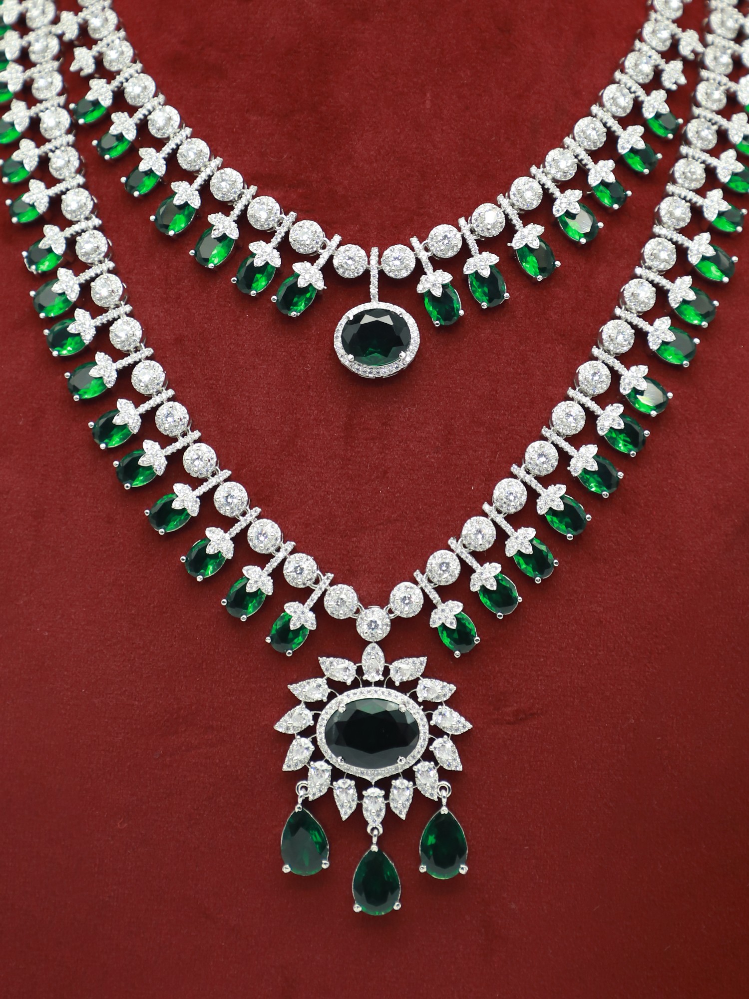 The necklace features a double-layered design, adding depth and dimension to the overall aesthetic. Each layer is adorned with intricately placed American diamonds, creating a seamless flow of sparkle. The floral motifs are delicate yet striking, adding a touch of femininity and grace. The attention to detail is evident in every facet, ensuring a piece that is both beautiful and durable. The coordinating earrings complement the necklace perfectly, featuring a similar floral design and the same dazzling American diamonds. Together, they create a harmonious and captivating set that is sure to become a treasured addition to your jewelry collection.