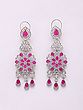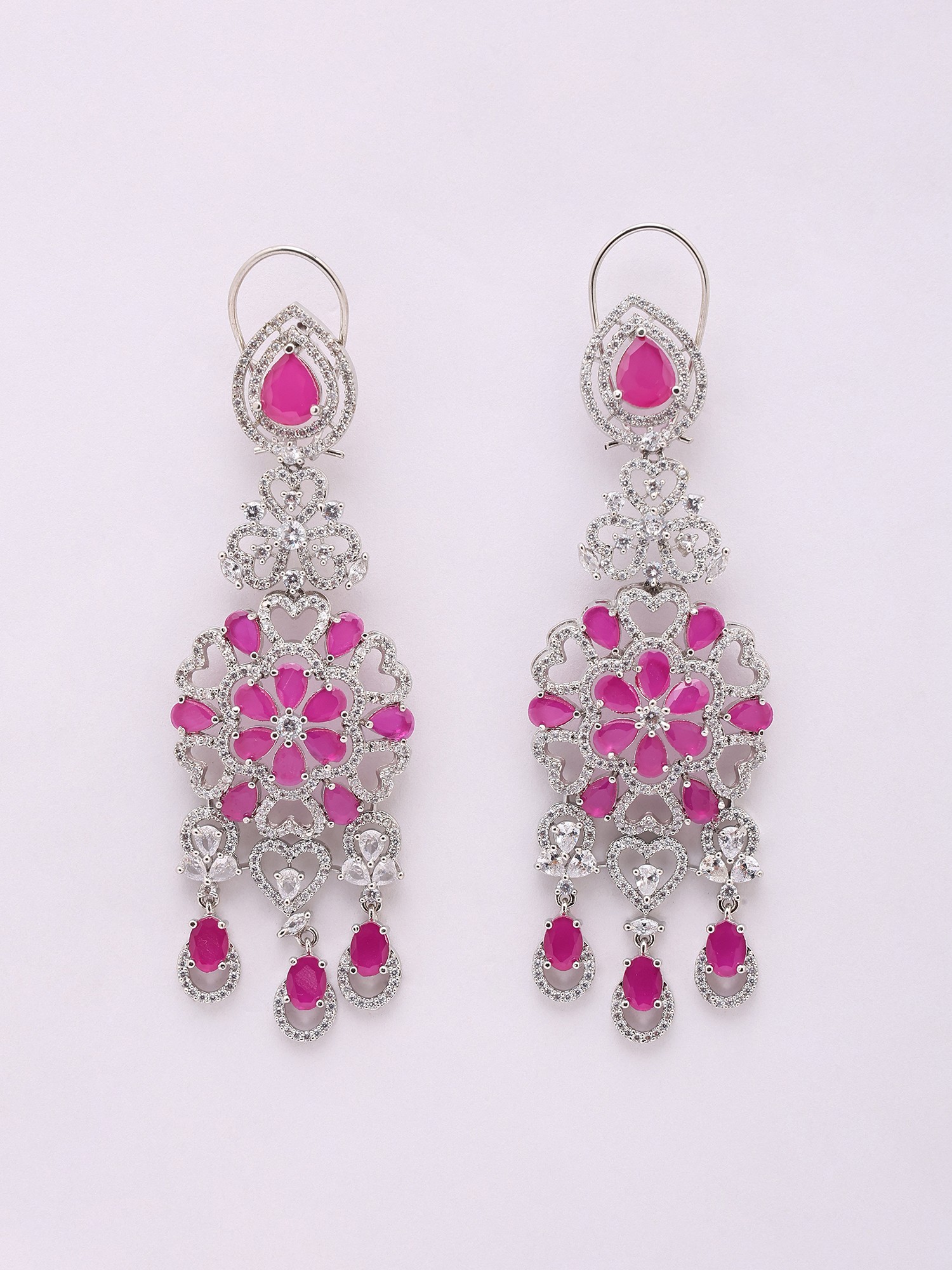The necklace gracefully drapes across the décolletage, extending to a generous 27 inches with an adjustable dori, allowing you to personalize its fit. Multi-strands of brilliant American diamonds form delicate chains, interspersed with vibrant floral arrangements and teardrop-shaped accents that capture and refract light with every movement. The accompanying earrings echo this exquisite design, boasting an impressive 3.55-inch height and a 1.15-inch width, creating a harmonious and captivating visual balance.