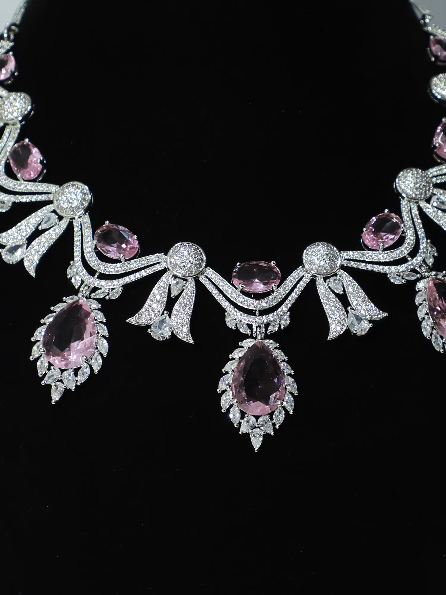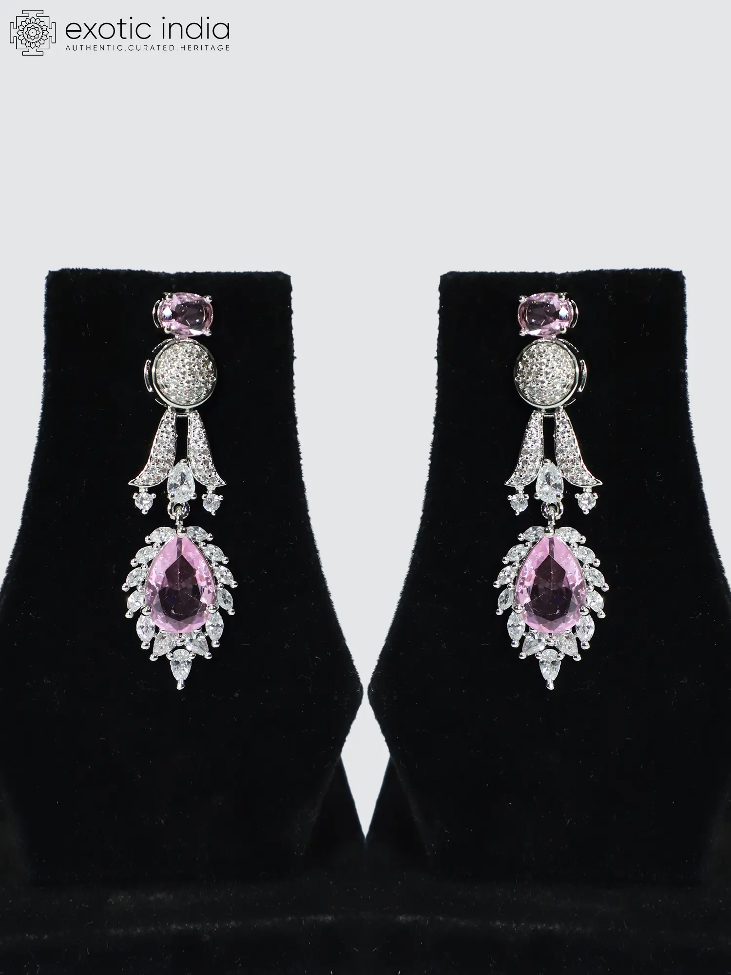 The necklace's graceful floral design is meticulously crafted, showcasing a cascade of shimmering American diamonds that beautifully frame the rich, deep pink ruby stones. The rubies, carefully selected for their captivating color and luminosity, serve as the focal points, adding a pop of color that complements the understated sparkle of the surrounding diamonds. The design flows elegantly, creating a truly mesmerizing piece that drapes beautifully around the neck. The matching earrings perfectly complement the necklace, echoing its floral motif and gemstone accents. The dangling design adds an extra layer of sophistication and movement, capturing the light with every graceful sway.