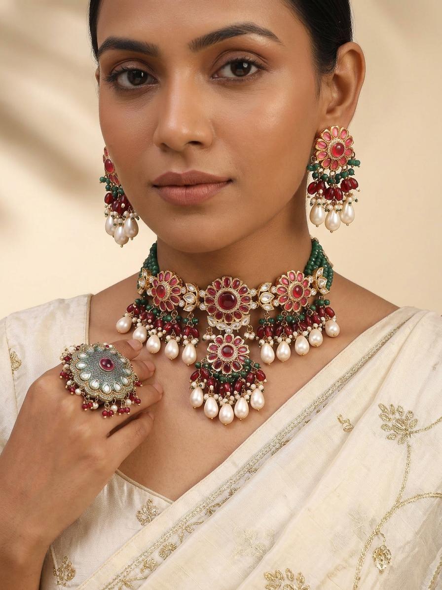 Multicolor Floral Design Stone Studded Choker Necklace Set With Earrings