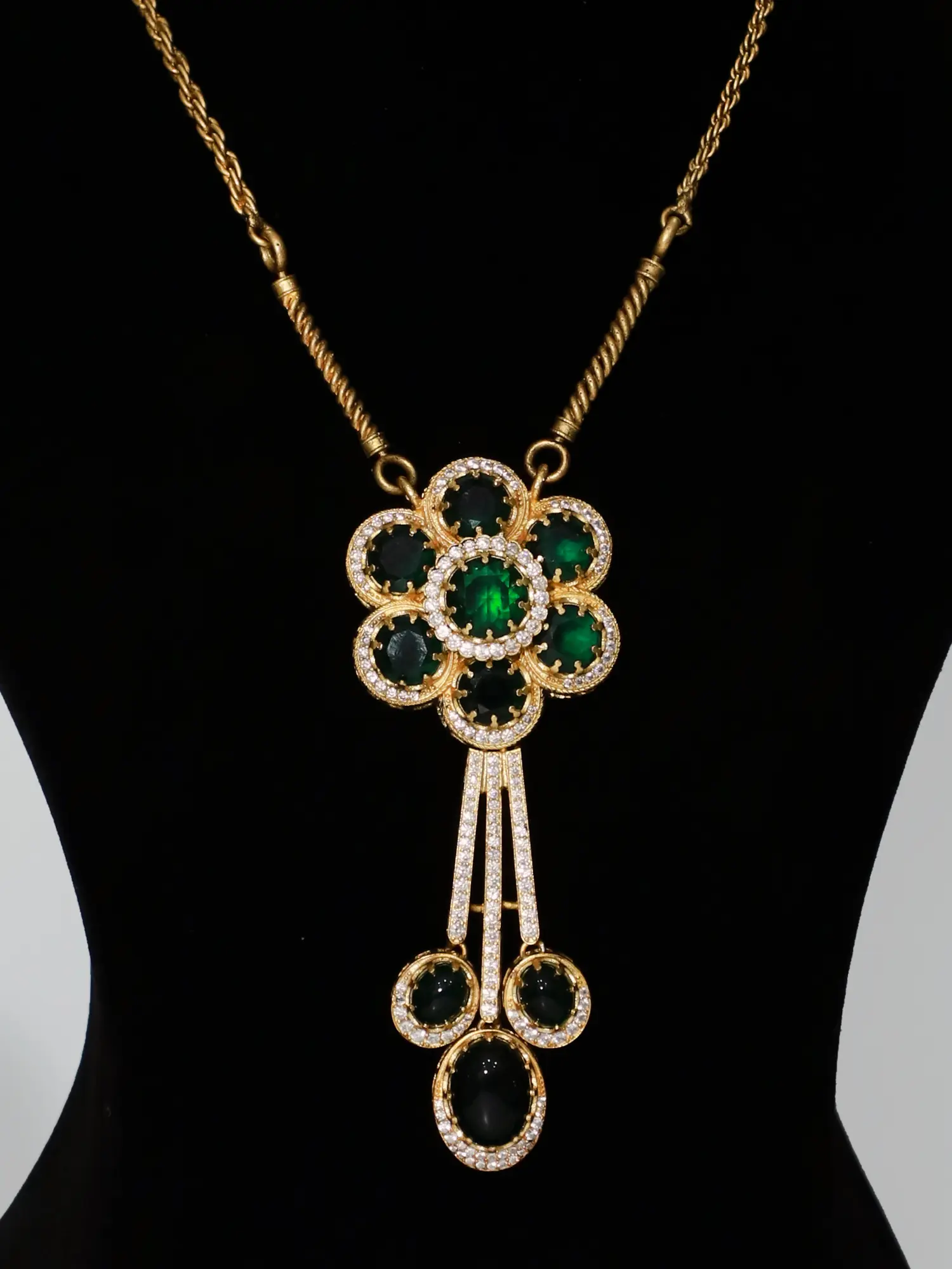 The necklace is a masterpiece of design, showcasing a central floral motif crafted with meticulously placed red stones. These vibrant gems are complemented by smaller, clear stones, creating a dazzling interplay of light and color. The pendant gracefully hangs from a delicate, twisted rope chain, adding a touch of elegance to the overall design. The matching earrings perfectly mirror the necklace's beauty, with their cascading design echoing the pendant's floral theme. Each earring features three red stones, accented by smaller clear stones, creating a look that's both sophisticated and eye-catching.