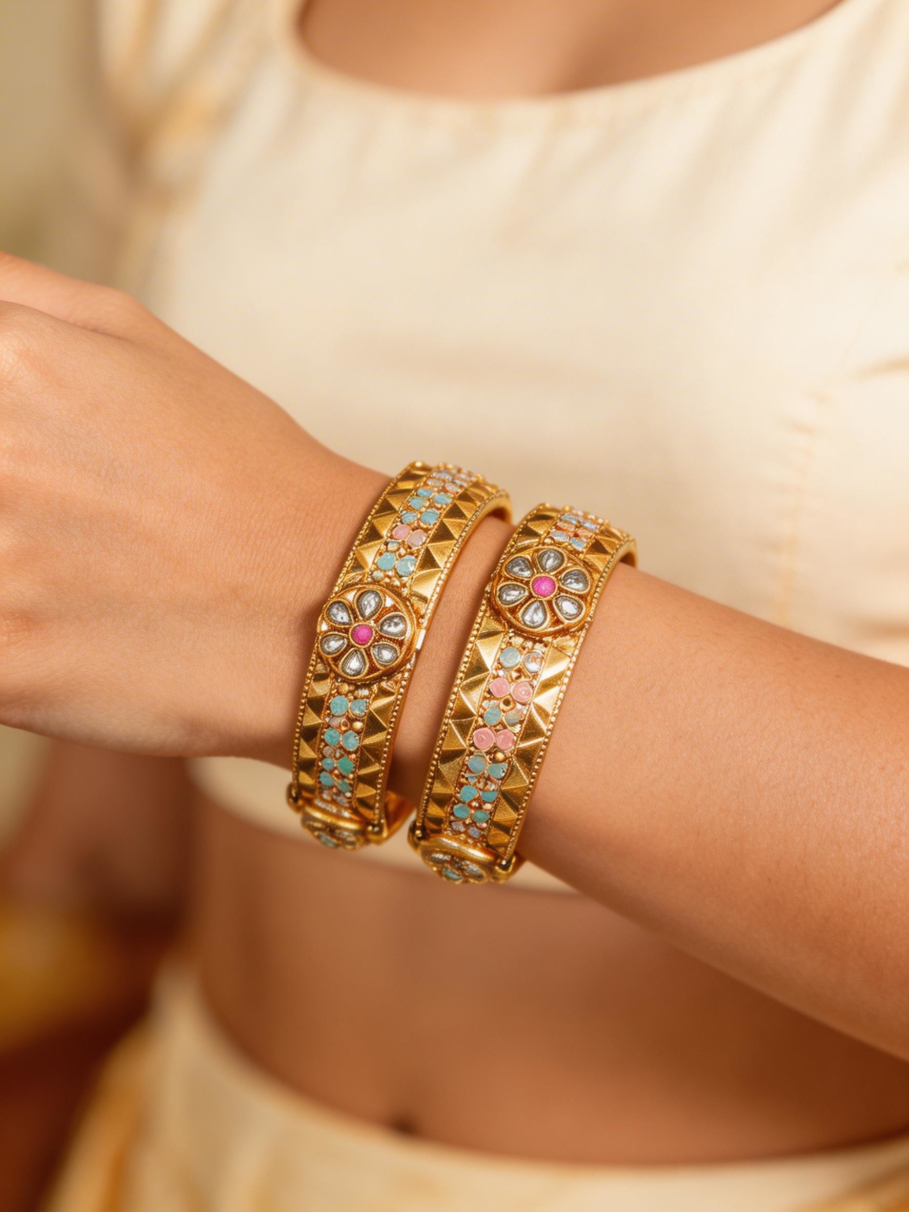 The intricate detailing of these bangles is truly remarkable. The delicate floral patterns, interspersed with shimmering stones in soft pastel shades of pink, blue, and white, create a mesmerizing visual effect. The skilled craftsmanship is evident in every curve and contour, showcasing a level of artistry that is both timeless and captivating. The contrast between the smooth golden surface and the textured floral designs adds depth and dimension to the piece, making it truly stand out. The use of high-quality stones ensures that the sparkle and shine will last for years to come, making these bangles a treasured addition to your jewelry collection.