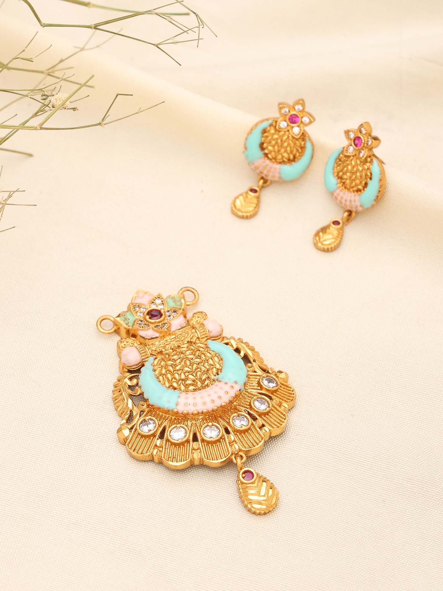 Stone Studded Pendant Necklace Set with Stud Earrings