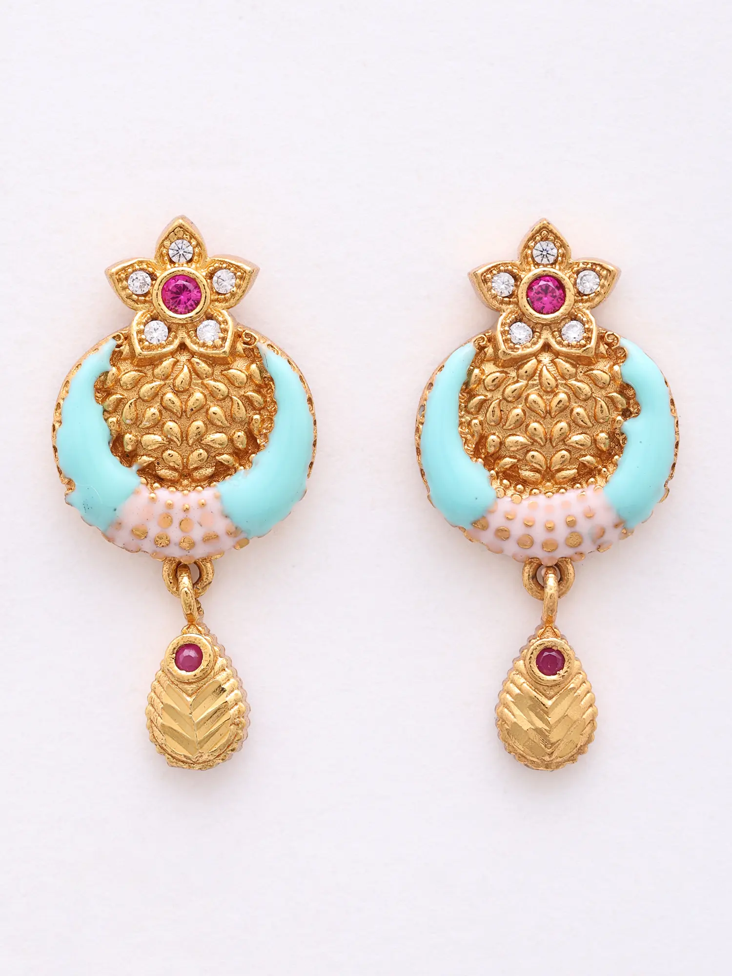 The pendant, a generous 2.12 inches in height, showcases a captivating floral half-moon design. Its surface is adorned with a rich tapestry of textured gold, interspersed with delicate pops of pastel enamel and sparkling stones that catch the light with every movement. Complementing this are the earrings, each measuring 1.15 inches in height and 0.45 inches in width. These smaller marvels echo the pendant's aesthetic, featuring intricate floral motifs and suspended droplet charms that add a playful yet sophisticated flair.