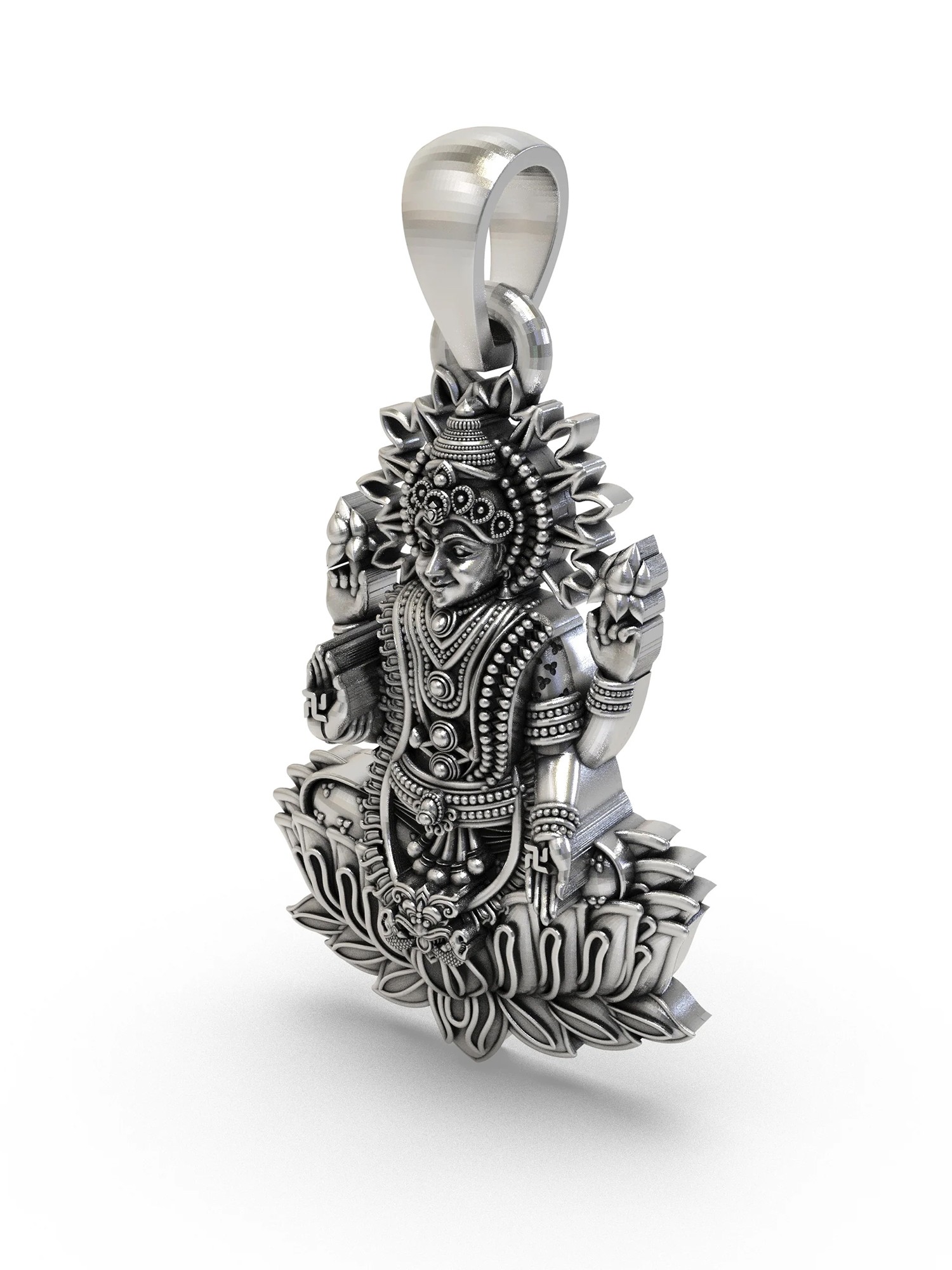 This exquisite pendant captures the benevolent essence of the Four-Armed Goddess, a powerful deity revered for her association with wealth, fortune, and abundance. Crafted from lustrous sterling silver, this piece is not merely an adornment but a symbol of blessings and divine favor, designed to bring a sense of peace and prosperity to its wearer. The meticulous detail showcases the Goddess seated gracefully on a blooming lotus, a symbol of purity, enlightenment, and spiritual growth.