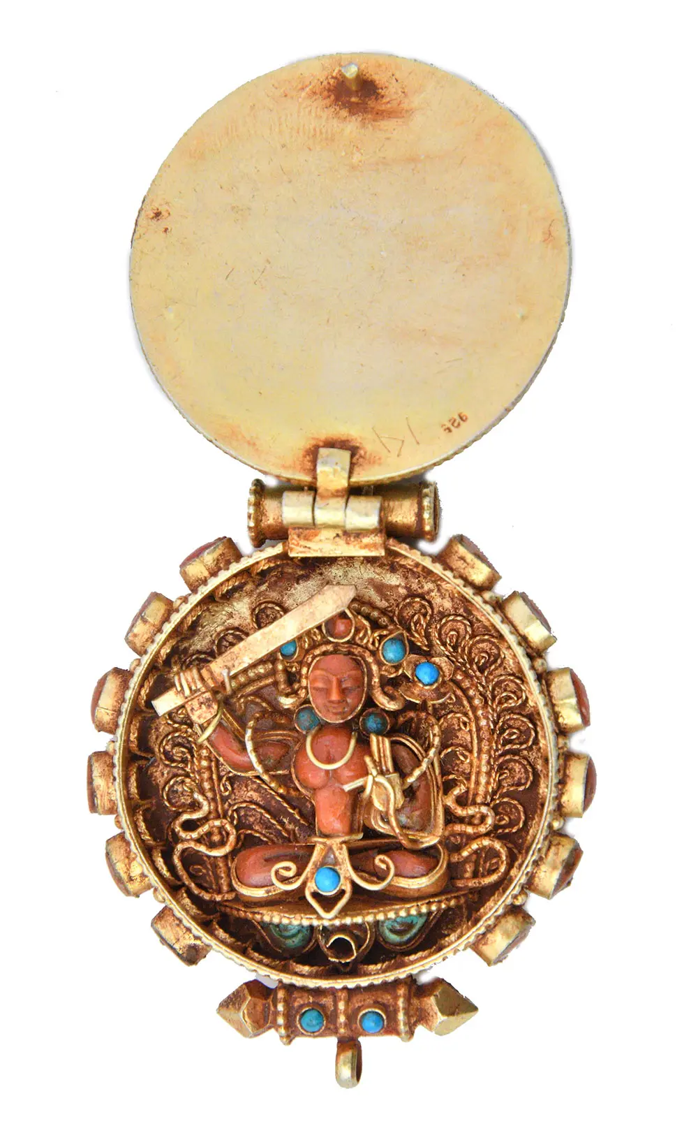 It is a fine example of Nepalese handiwork. While the paintings and sculptures produced in the region are coveted by spiritual art patrons across the world, its jewellery is no less. This pendant boasts of a sterling silver foundation, overlaid with dense gold filligree and gemstone embellishments. The delicate tracery as well as the pastel blue and red gems, each more exquisitely shaped than the other, are both characteristic of regional workmanship. The quadrilateral motif that dominates the foreground (and surrounds the central red, gold-rimmed gemstone) is the all-important Buddhist mandala.
