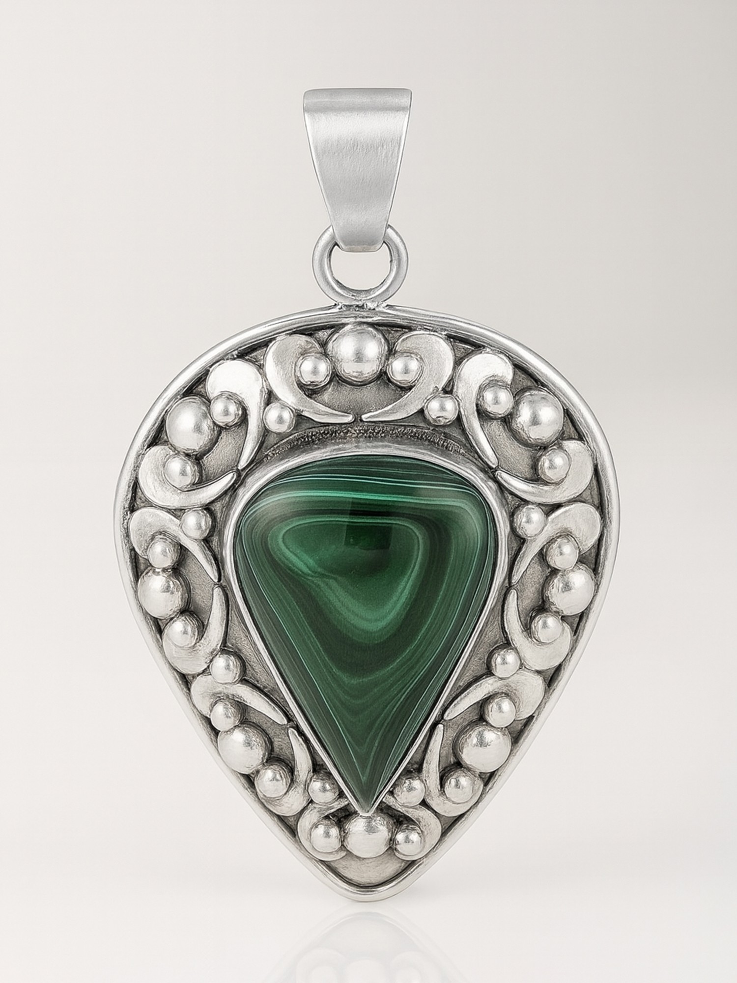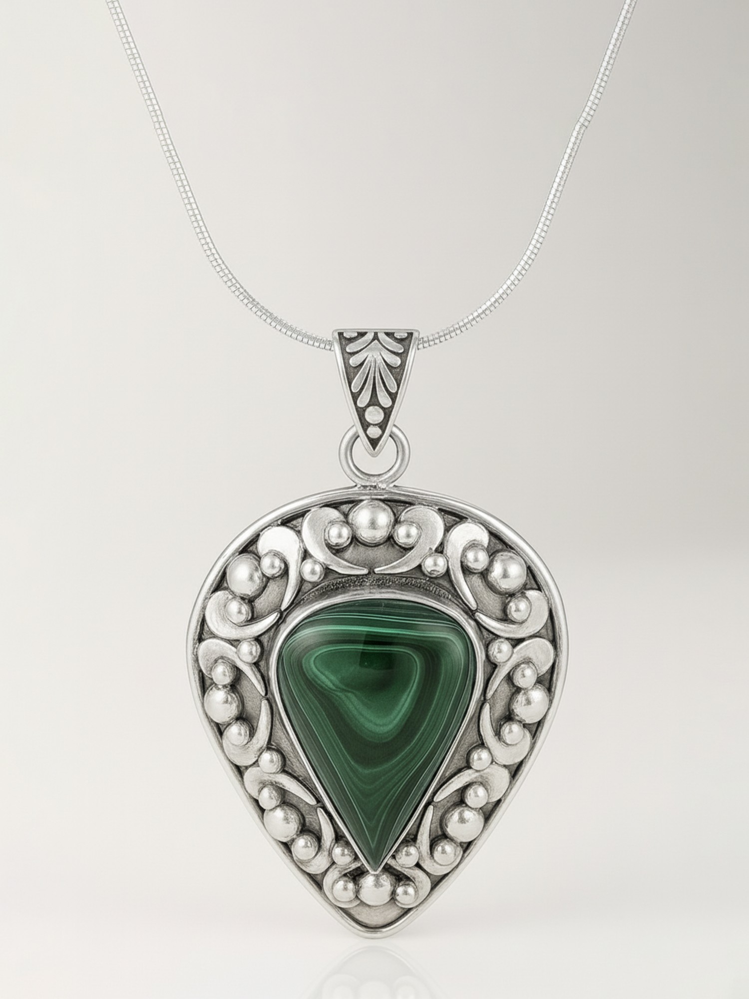 This pendant boasts the deep, banded greens of Malachite, known for its rich layers and vibrant patterns. The stone is believed to embody the lush, pulsating life force of nature itself, offering a touch of healing and transformation.