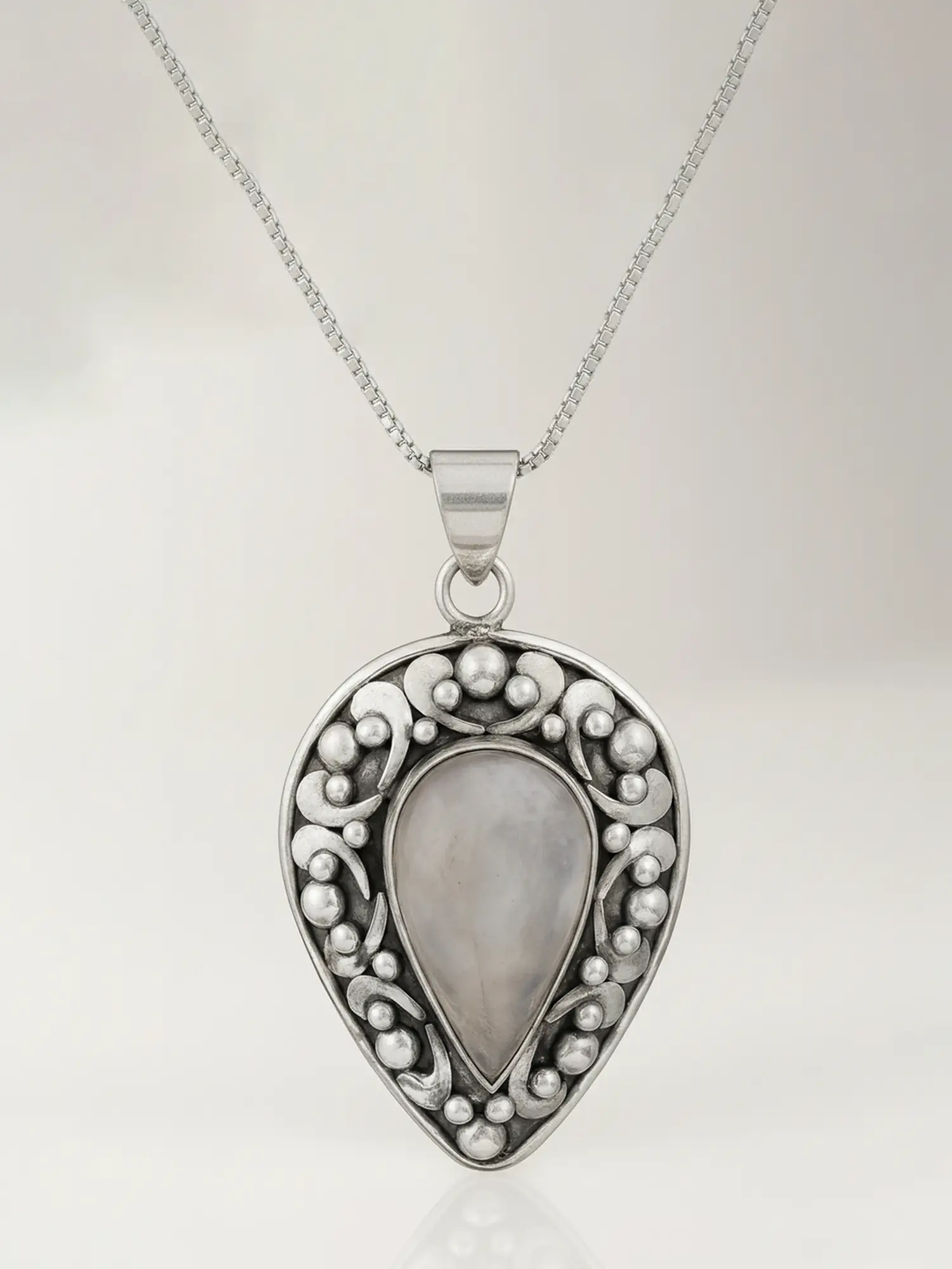 With its ethereal glow, the Rainbow Moonstone pendant captures the essence of moonlight cascading softly onto water. Revered for its luminescence, this gem is said to enhance intuition and bring balance and harmony to its wearer.