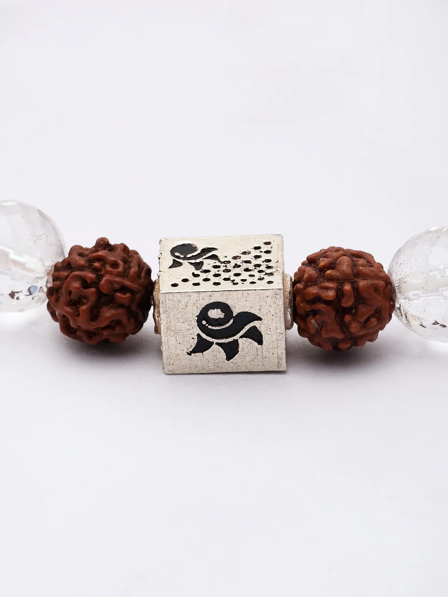 At the heart of the bracelet lies a specially designed sterling silver charm. This meticulously crafted element adds a touch of refined luxury and serves as a focal point, subtly enhancing the overall aesthetic. The cool sheen of sterling silver complements both the natural warmth of the Rudraksha and the vibrant sparkle of the quartz, creating a harmonious and balanced design. The charm is securely integrated, ensuring both durability and a polished finish.