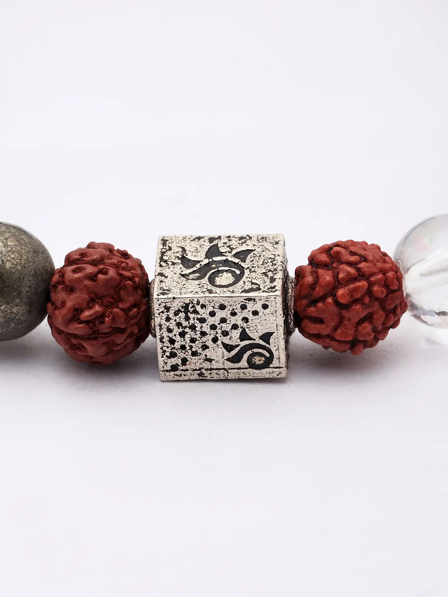 At the heart of this bracelet lies the authentic Rudraksha seed, revered for its spiritual properties and distinctive textured appearance. Interspersed with the Rudraksha are a curated selection of natural stones, including the grounding allure of lava stone, the shimmering iridescence of pyrite, and the warm, earthy tones of tiger's eye. Clear quartz beads add a touch of pure clarity, symbolizing new beginnings and amplified energies. The variety of textures and colors creates a dynamic and engaging aesthetic, making each glance at your wrist a new discovery.