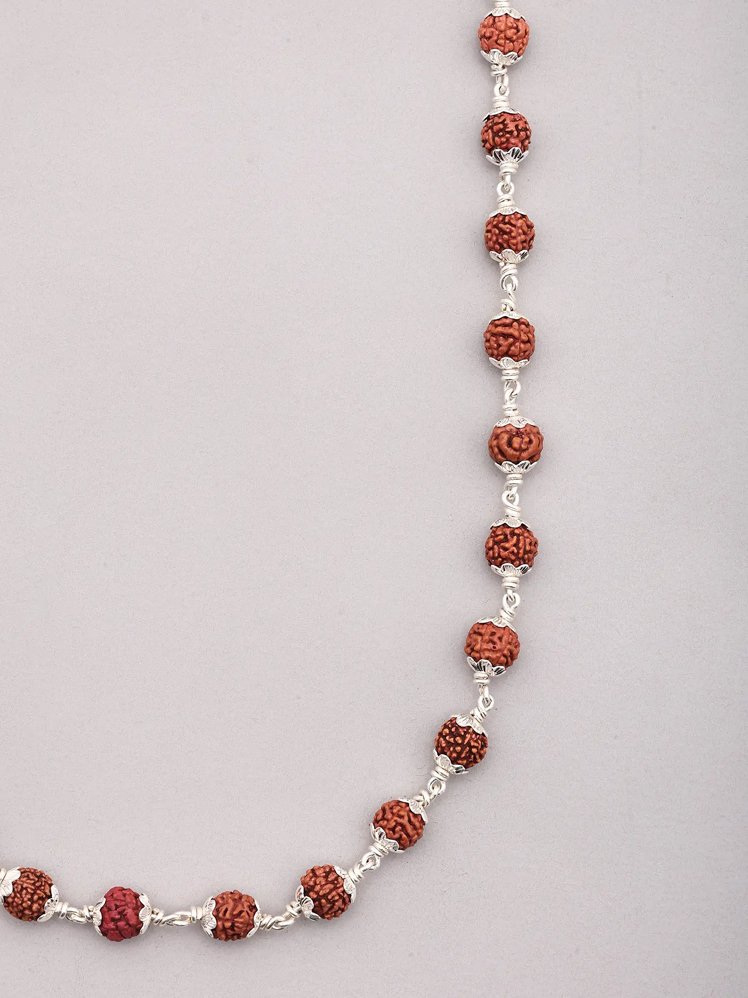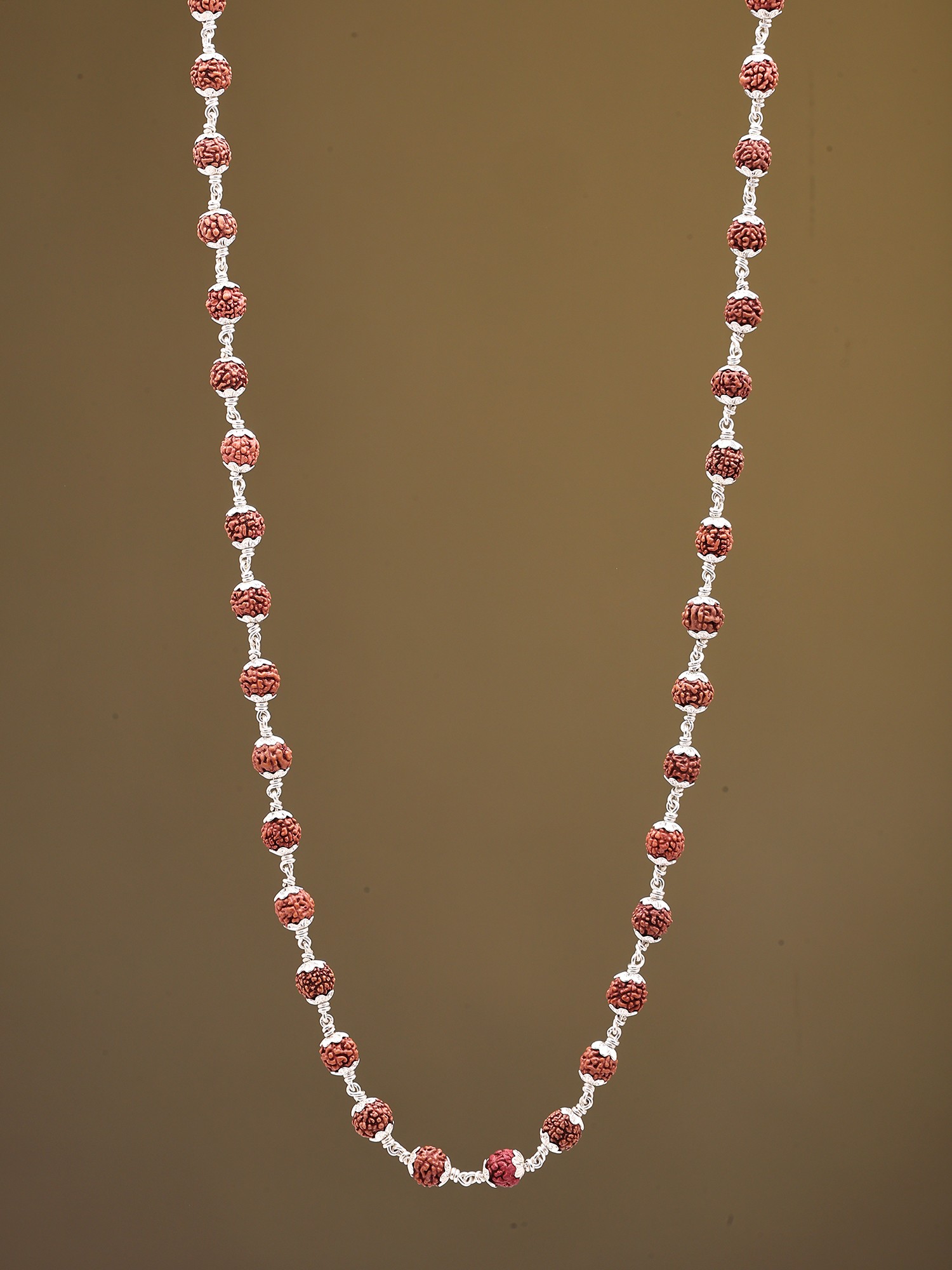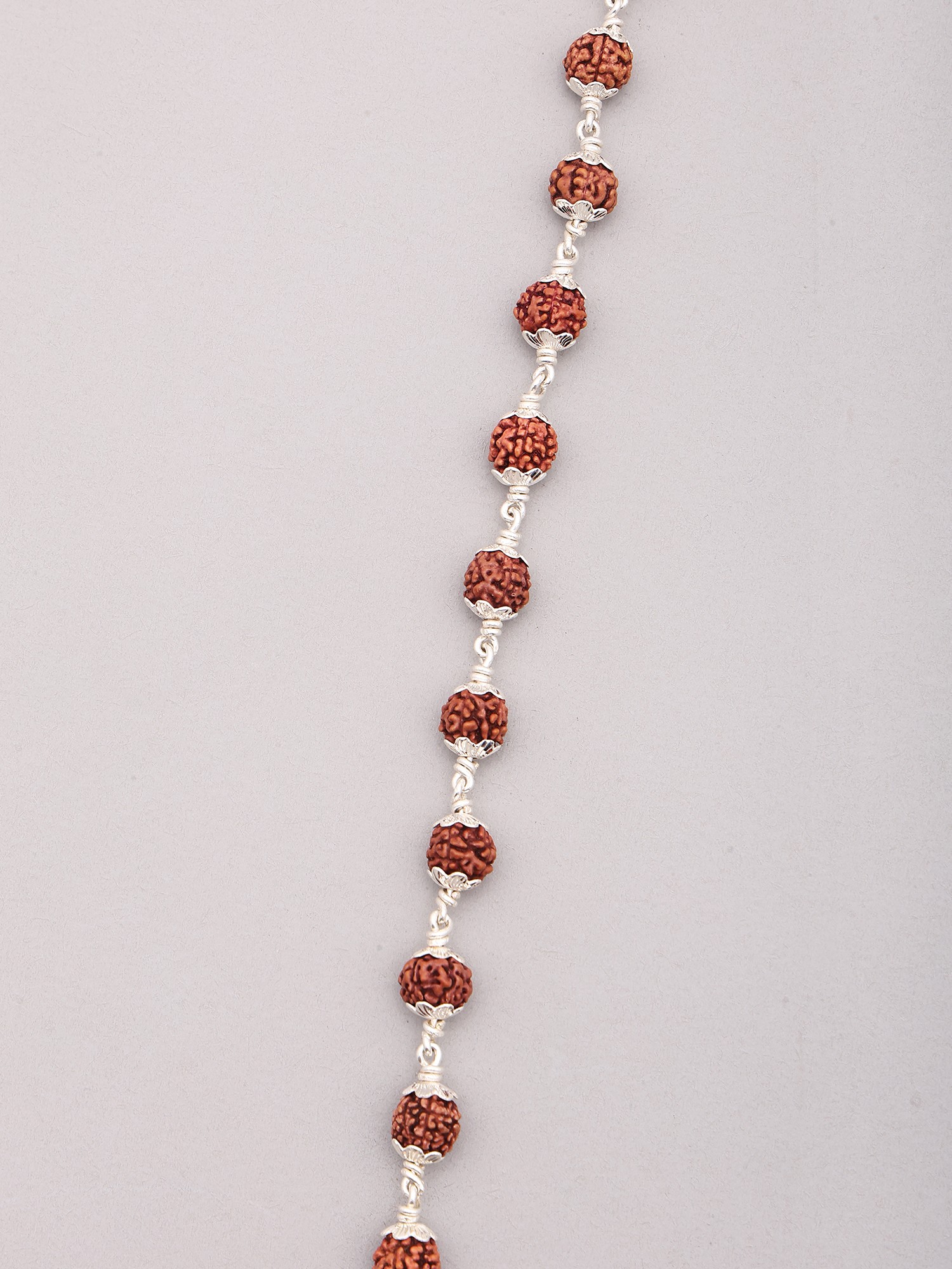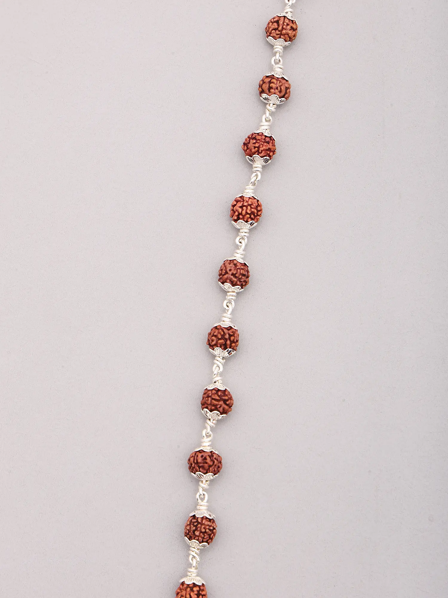 The rich, earthy tones of the Rudraksha beads are beautifully complemented by the cool, lustrous shine of sterling silver. Each bead is meticulously wire-wrapped, creating delicate silver links that allow the Rudraksha to move freely and catch the light. This intricate detailing not only enhances the visual appeal but also ensures the longevity and integrity of the piece. The silverwork adds a touch of modern sophistication to the ancient seed, making it a versatile accessory suitable for any occasion, from casual outings to more formal gatherings. ––––––––––––––––––