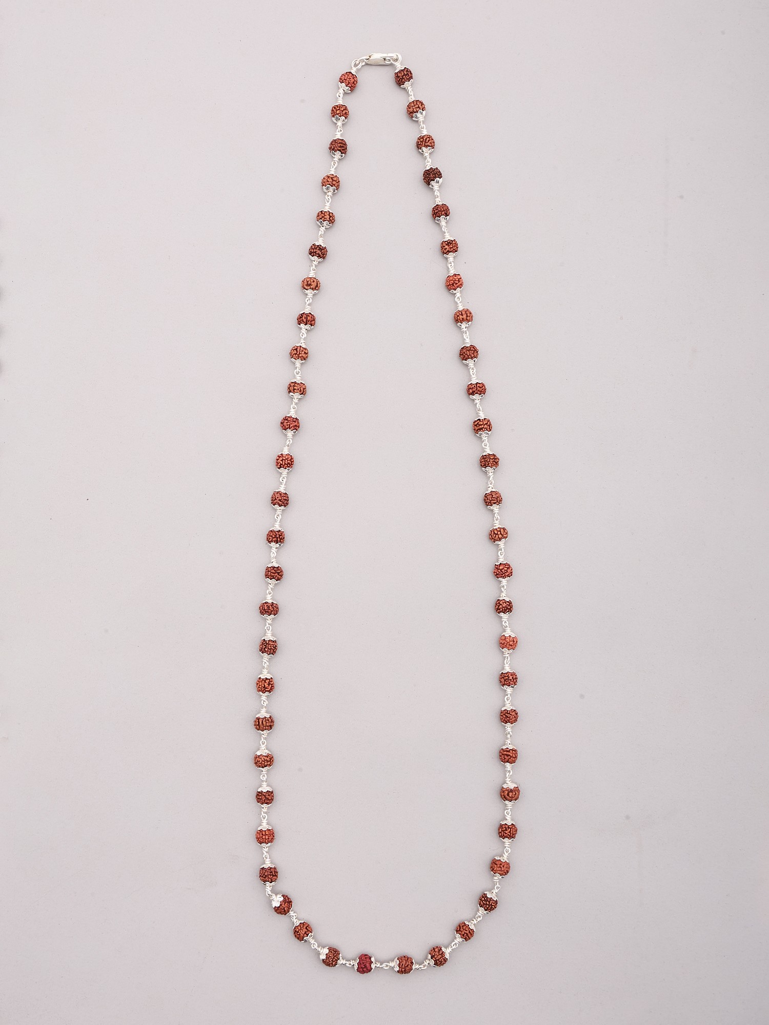 Designed to be worn close to the heart, this necklace is presented on a 15-inch chain, resting gracefully on the décolletage. The smooth finish of both the Rudraksha and the silver ensures a comfortable wearing experience throughout the day. This piece is more than just a beautiful necklace; it's an invitation to connect with a tradition that has inspired mindfulness and well-being for generations. Whether you are a long-time practitioner of spiritual disciplines or simply seeking a unique and meaningful piece of jewelry, this Rudraksha mala offers an unparalleled combination of aesthetic appeal and spiritual resonance. It makes for a thoughtful and cherished gift for loved ones, symbolizing blessings, protection, and inner harmony.
