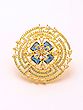 The design unfolds in a mesmerizing geometric pattern, reminiscent of ancient mandalas. Brilliant American diamonds are meticulously embedded, radiating light with every facet. At its heart, deep sapphire-toned stones provide a dramatic focal point, their rich hue contrasting beautifully with the surrounding sparkle. The overall impression is one of sophisticated symmetry and captivating brilliance, with a width of 1.6 inches and a height of 1.3 inches making a noticeable yet elegant statement.