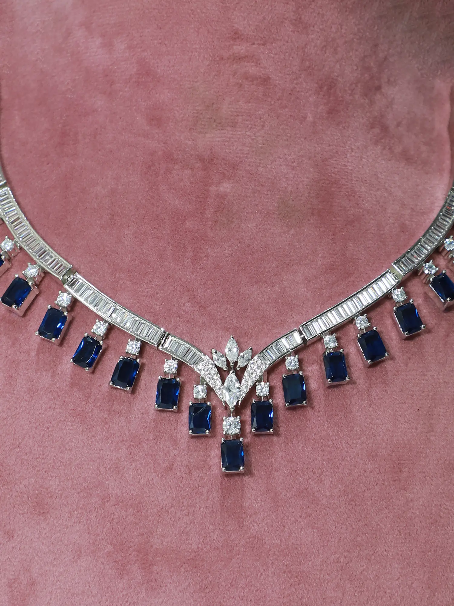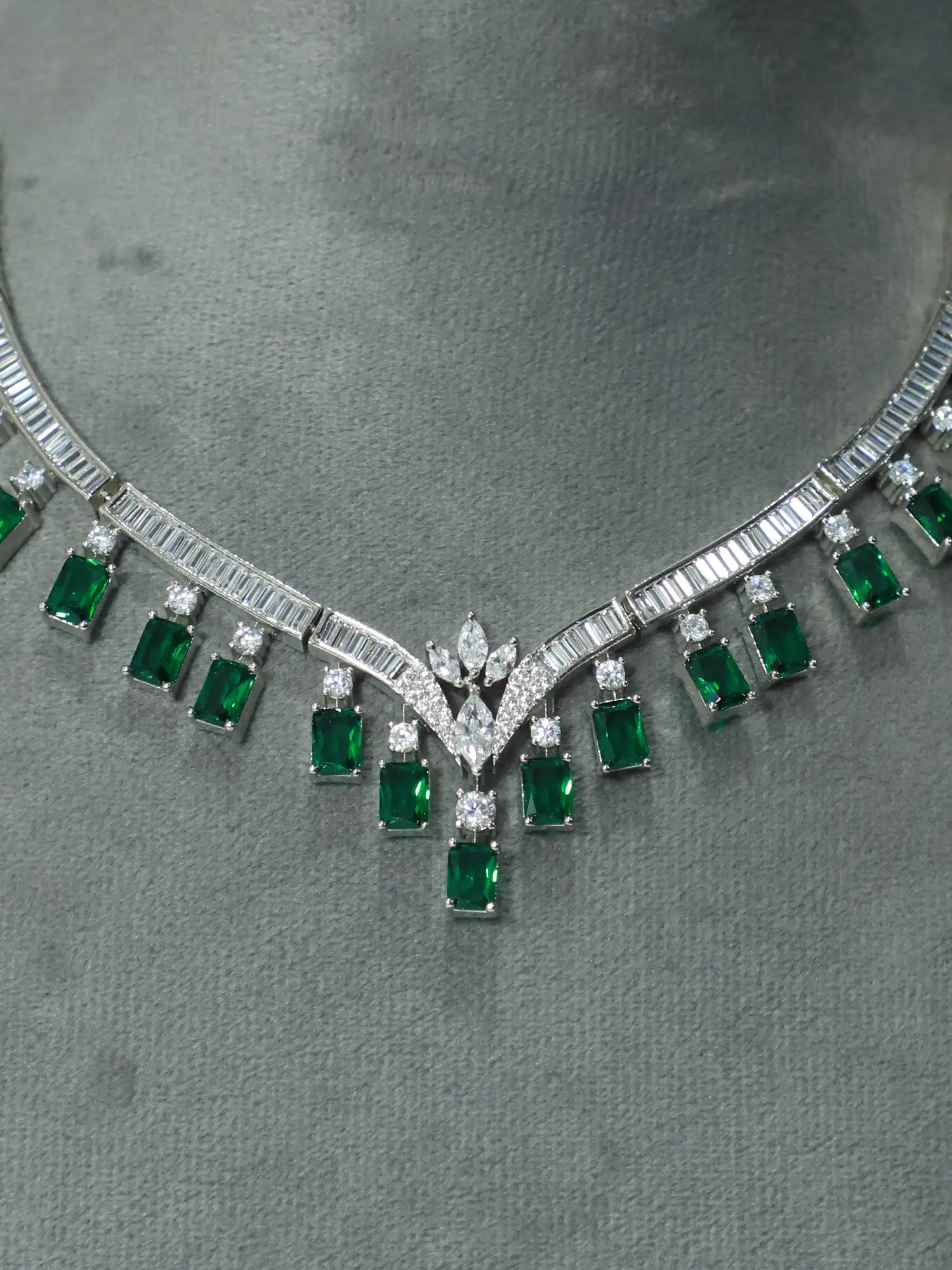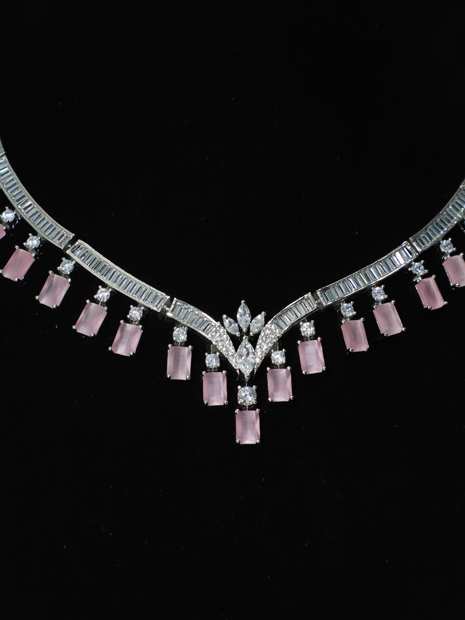 Elevate your jewelry collection with this stunning necklace set. The design merges contemporary geometric patterns with the timeless sparkle of American Diamonds, creating a versatile piece that will enhance any outfit. Perfect for adding a touch of refined glamour to special occasions, or even injecting a little luxury into your everyday style.