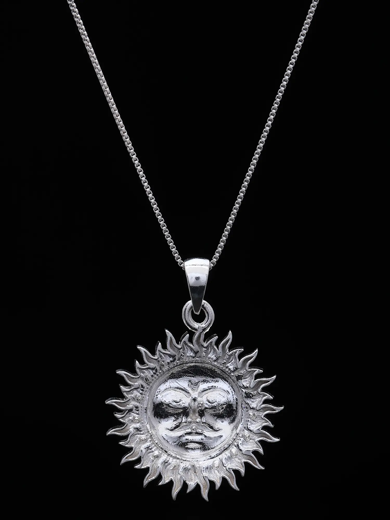 This is more than just a pendant; it's a statement. Expertly crafted, this piece captures the essence of the sun in stunning detail. Each ray emanating from the central face is meticulously sculpted, giving the impression of dynamic movement and energy. The solid construction lends a substantial feel, promising durability and lasting beauty. Its subtle shine catches the light beautifully, making it a conversation starter and a unique addition to any jewelry collection. The design balances intricate artistry with a touch of mystique, making it suitable for a variety of styles and preferences.