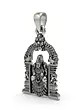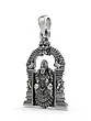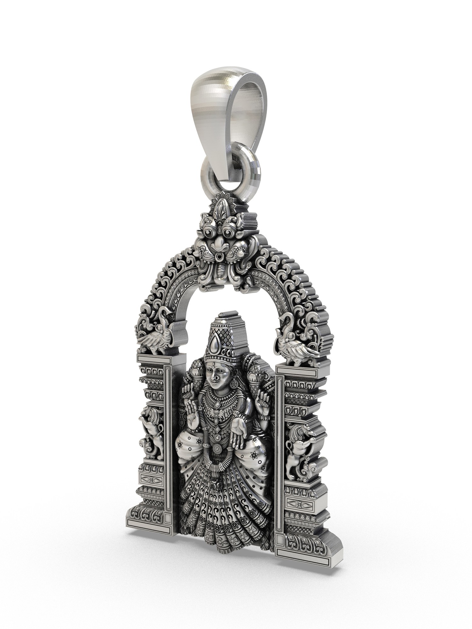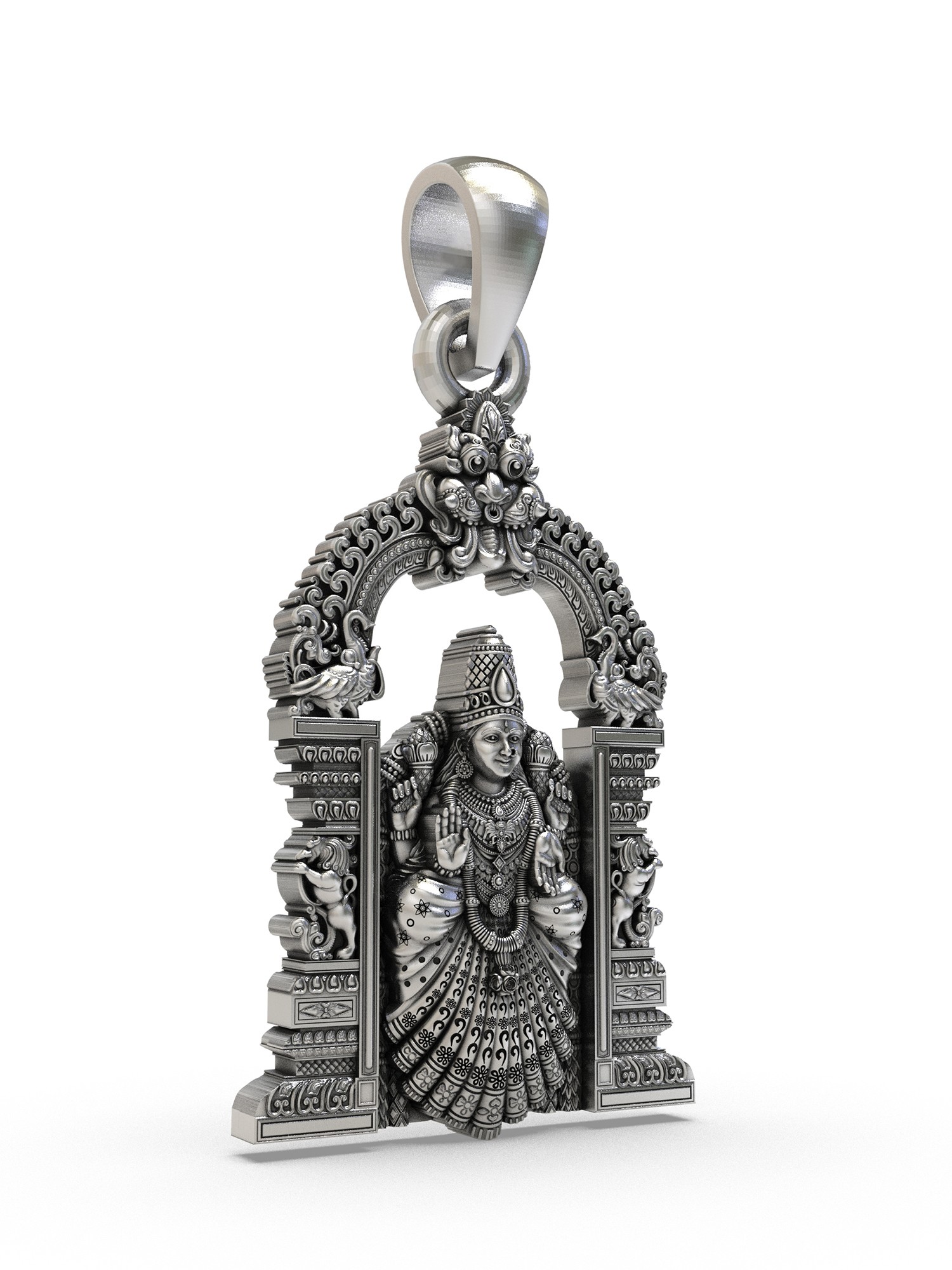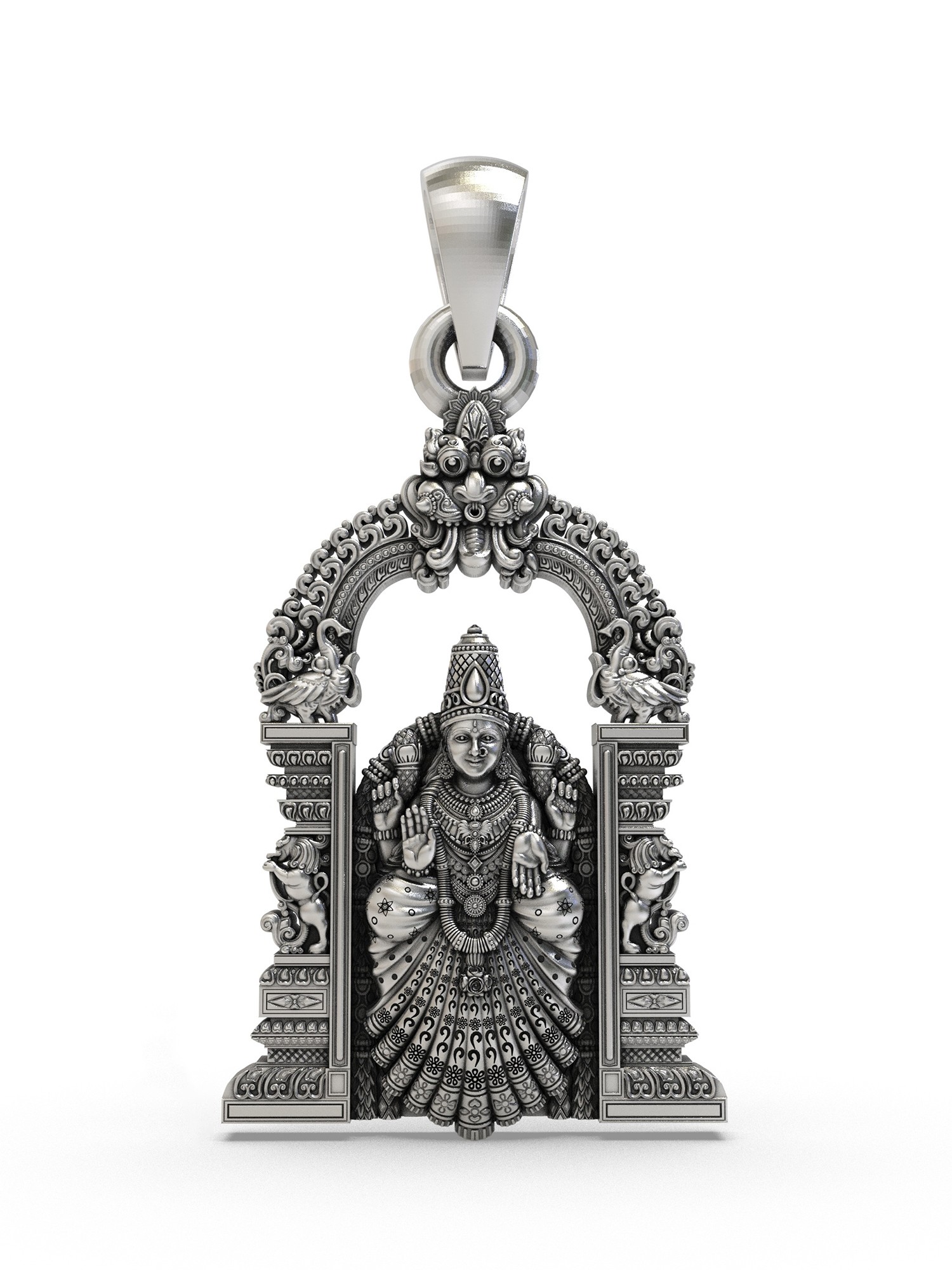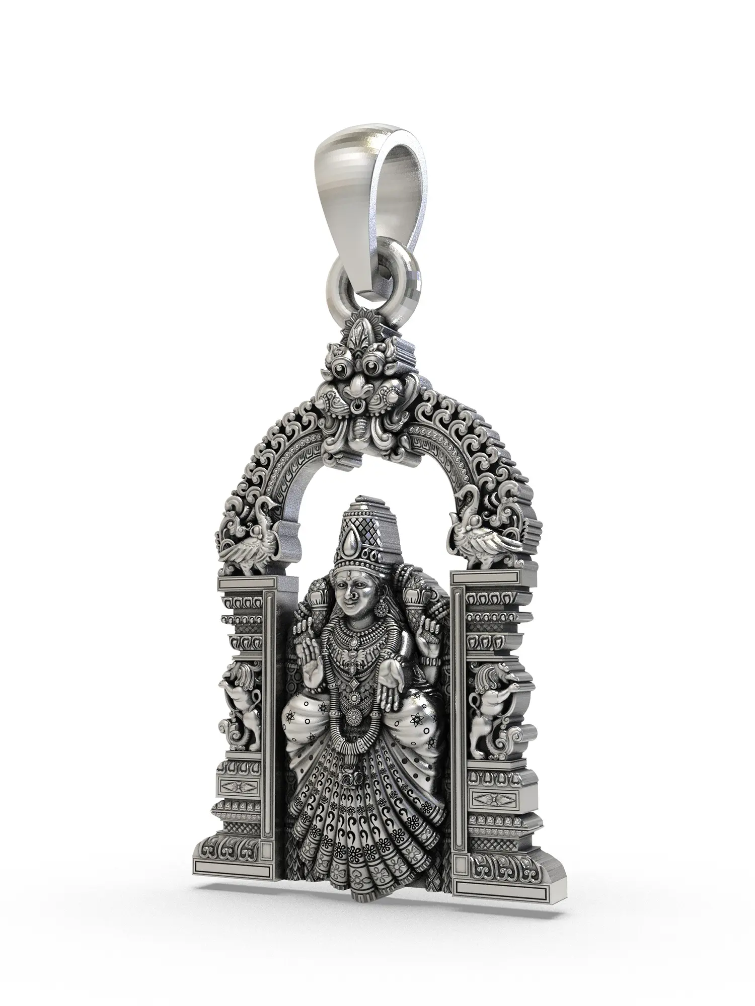 The pendant is framed within an elaborately decorated arch, supported by intricately designed pillars. At the top of the arch, one can see the detailed carvings that add to its aesthetic appeal. The design draws inspiration from traditional temple architecture, lending a sense of sacredness and reverence to the piece. The overall structure creates a sense of depth and dimension, drawing the eye deeper into the divine representation at its heart. The Goddess is depicted in a posture of blessing and abundance, inviting positive energy into the wearer's life. The details in her attire, the posture of her hands, and the crown upon her head, are all symbolic, contributing to the depth of meaning embedded in the pendant.