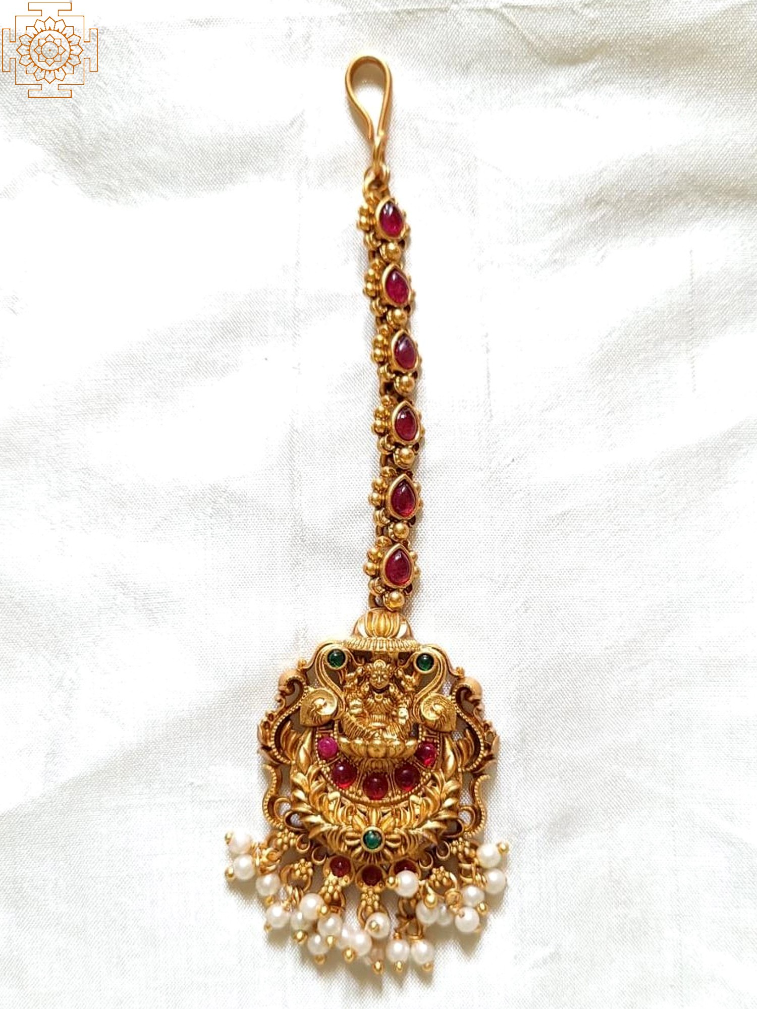 The Maang Tikka is meticulously designed to honor Goddess Lakshmi. She is depicted in a serene posture, surrounded by ornate floral motifs and peacocks, symbols of beauty and grace. These symbolic elements are expertly interwoven with the delicate chain, which is adorned with sparkling ruby-colored stones, adding a touch of regal elegance. The use of both ruby and emerald gemstones further enhances its charm, mirroring the rich colors found in traditional Indian artistry. The lower portion of the maang tikka features a stunning cascade of pearls, adding a soft, romantic touch to the overall design.