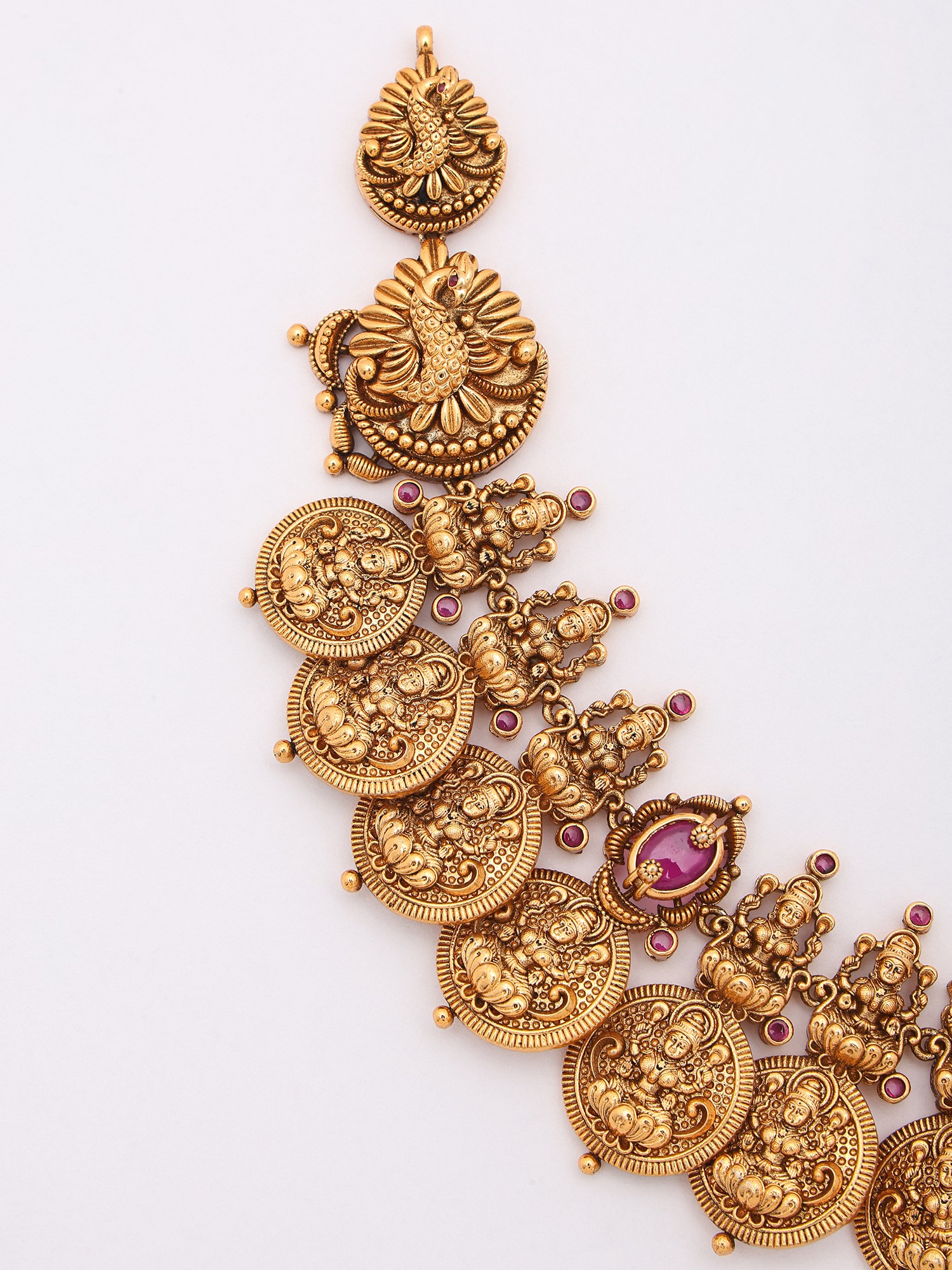 This design draws inspiration from the revered traditions of South India, where the depiction of Goddess Lakshmi, the embodiment of wealth and good fortune, is central to cultural and spiritual practices. Such pieces have been cherished for generations, symbolizing blessings, abundance, and divine favor, making them more than just jewelry, but also heirlooms of significant cultural value.