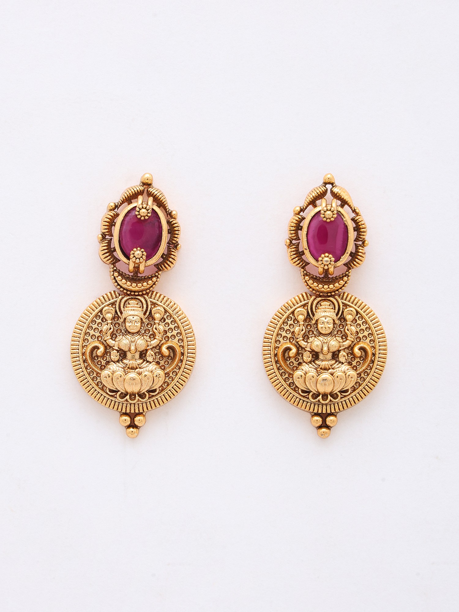 The necklace boasts a commanding presence with its cascading series of Goddess Lakshmi motifs, each rendered with profound detail. Accented by vibrant, deep-hued stones, these medallions are interspersed with delicate beadwork, creating a harmonious visual flow. The accompanying earrings echo this design, offering a perfectly balanced complement. The substantial height of the necklace, approximately 6 inches, ensures it rests beautifully on the décolletage, while the earrings, measuring 1.75 inches in height and 0.62 inches in width, provide an elegant dangle.