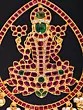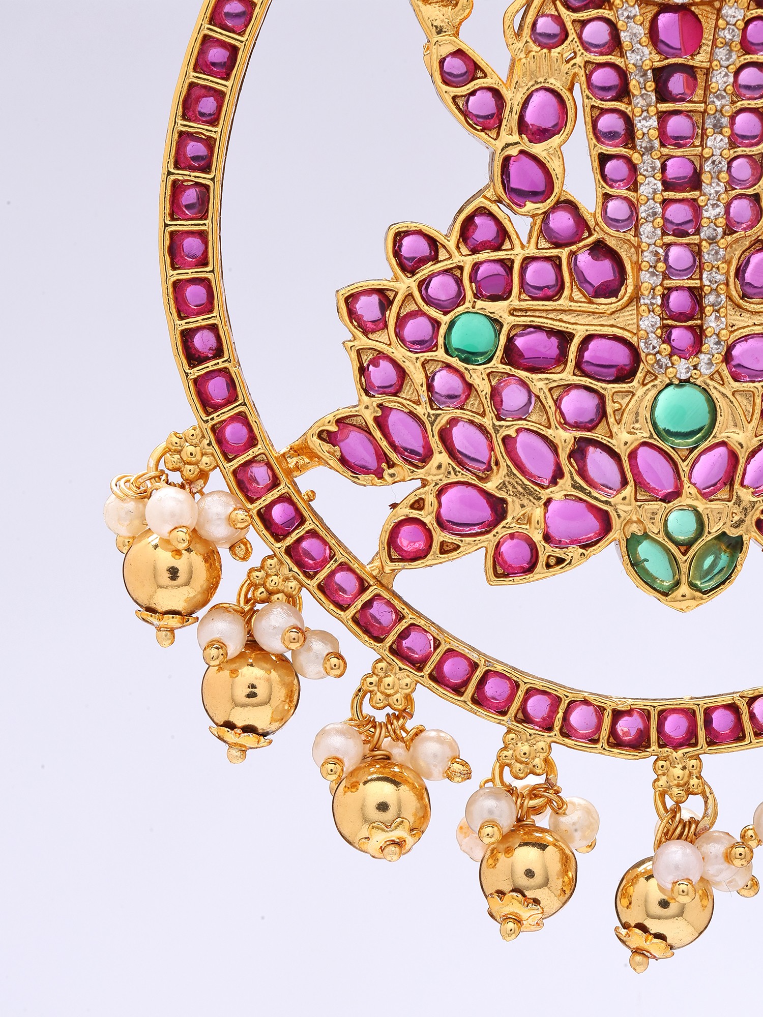 Adorned with vibrant ruby-colored stones and shimmering emeralds, this piece is a symphony of color and light, with delicate white accents adding a further layer of sparkle. The central depiction of a revered deity is rendered with remarkable clarity, encircled by a border that is both robust and beautifully detailed. Cascading pearl and gold accents add a gentle sway and subtle chime, enhancing its opulent charm and refined aesthetic. The overall dimensions of 3.3 inches in height and 2.35 inches in width ensure a prominent yet balanced presence.
