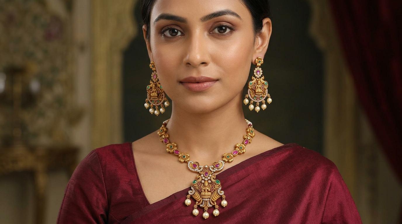 Stone Studded And Beaded Temple Goddess Traditional Necklace With Earrings