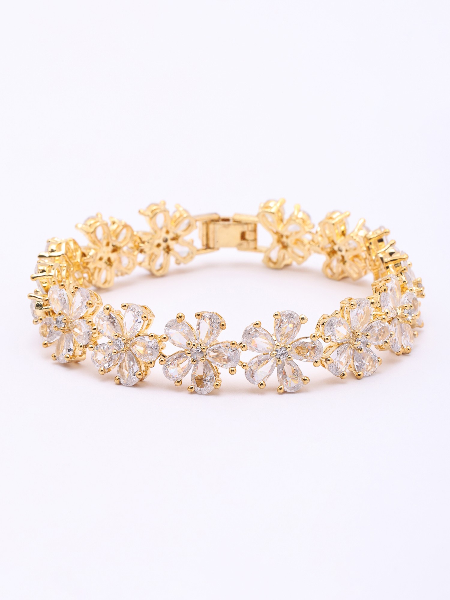 The visual appeal lies in the captivating interplay of light as it dances across the meticulously faceted stones. Each flower-inspired element measures a refined 0.45 inches in width, creating a gracefully proportioned statement. The entire piece extends to a comfortable 7.5 inches in length, designed to elegantly encircle the wrist, offering a subtle yet impactful presence.