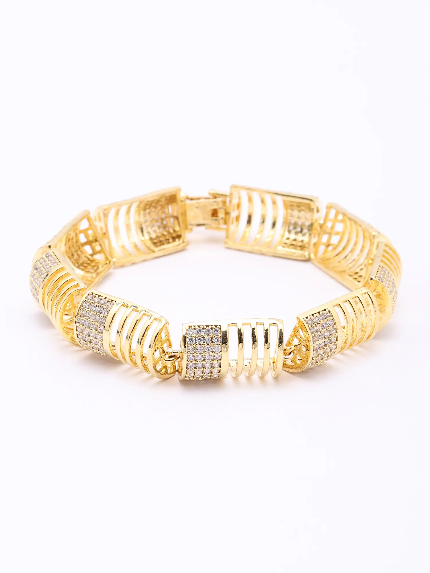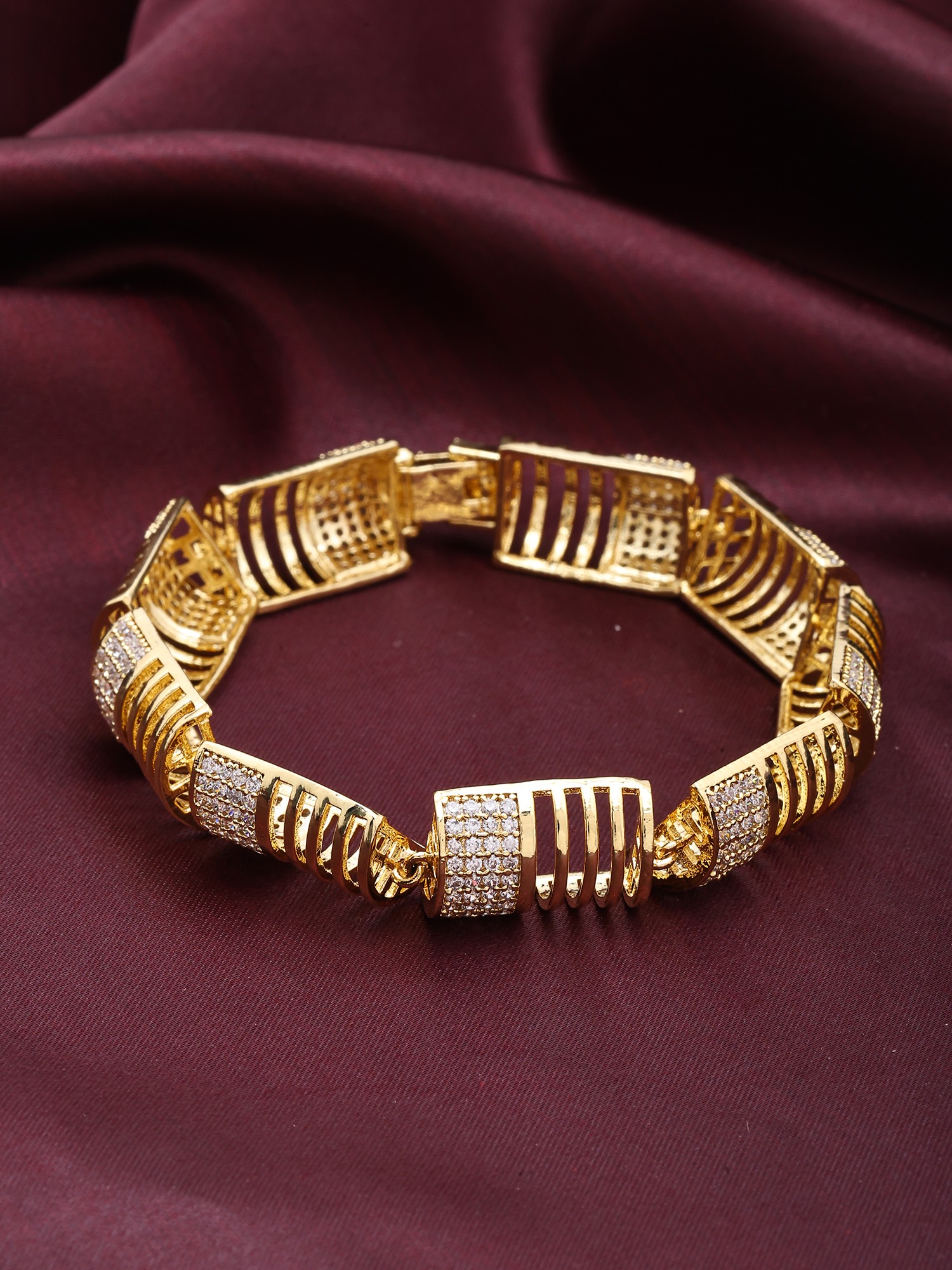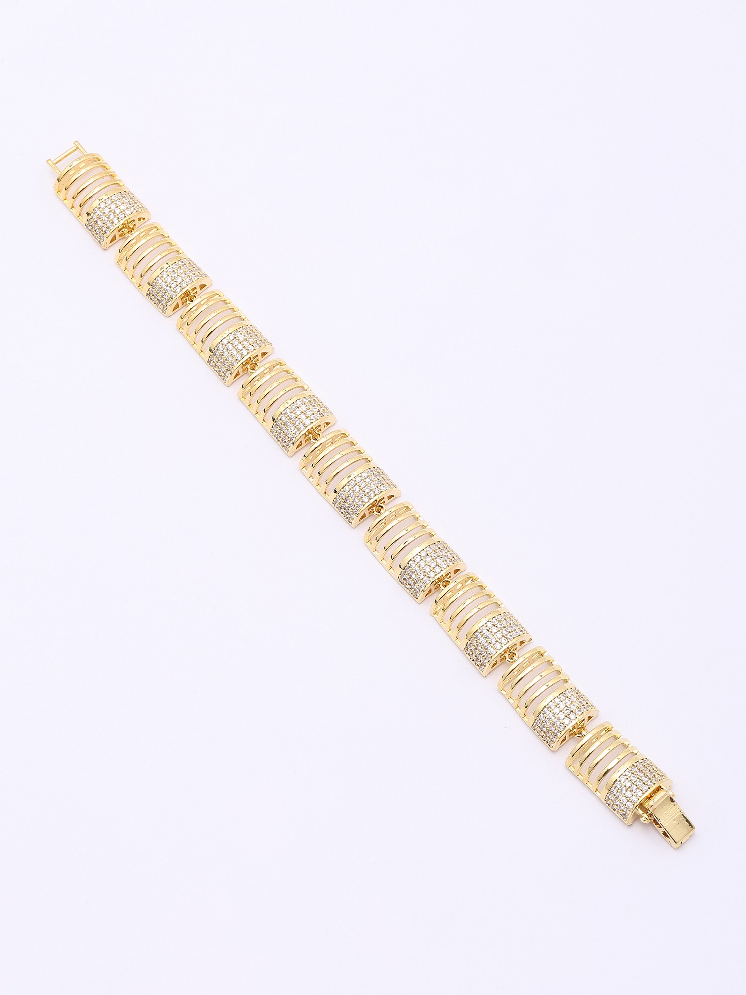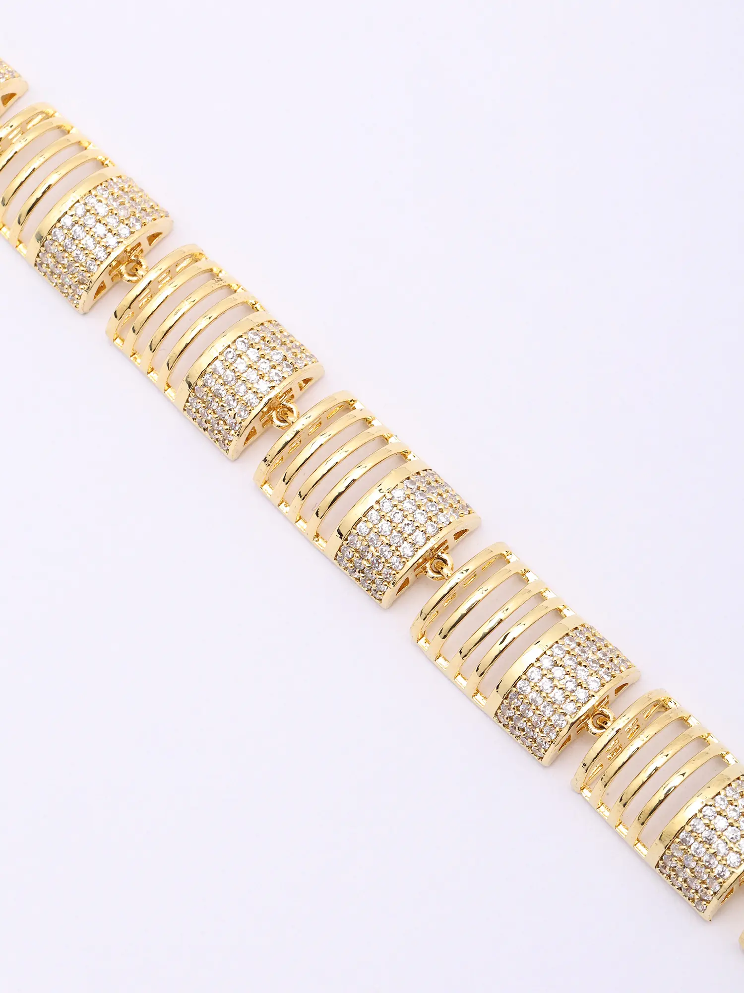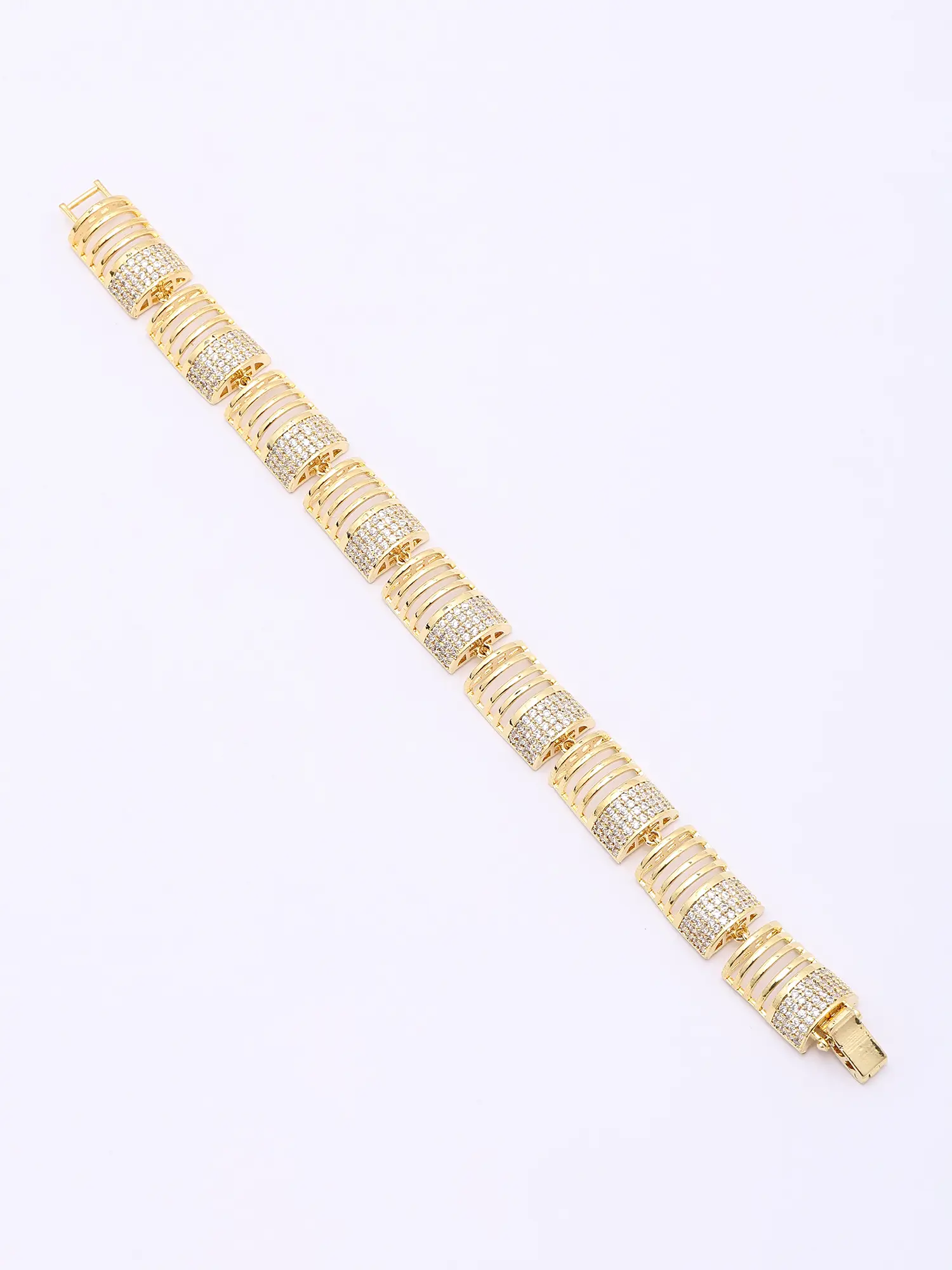 Crafted with meticulous attention, this bracelet showcases a luxurious gold finish that gleams with a warm, inviting radiance. The design features precisely set American diamonds, chosen for their brilliant sparkle and enduring allure. Each segment is expertly articulated, allowing for a fluid drape that feels as exquisite as it looks.