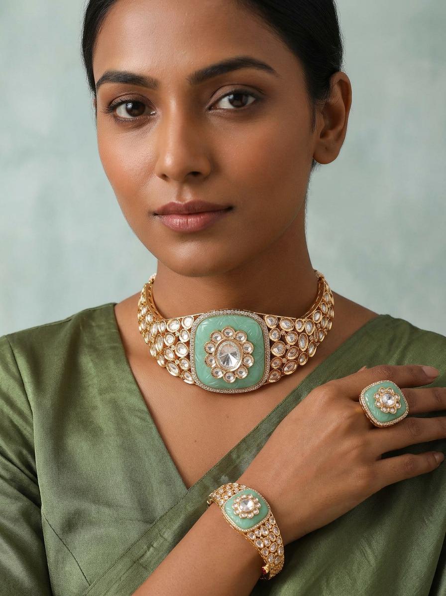 Openable Kundan Bracelet with Floral Design & Green Stones