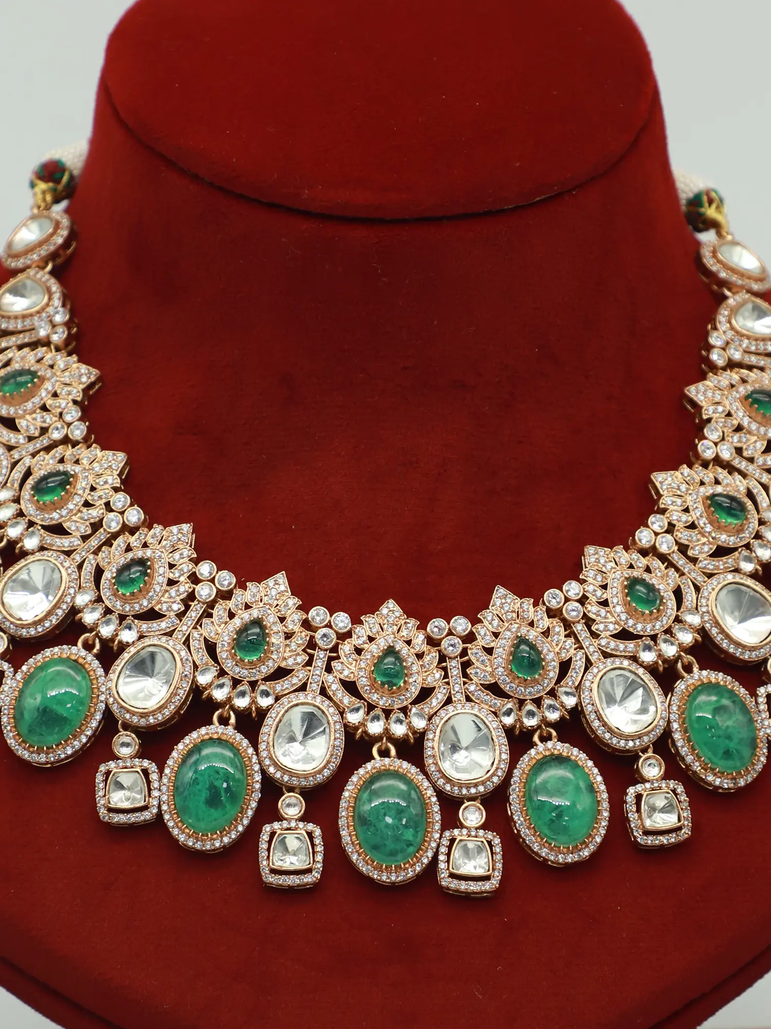 Features a statement necklace and matching dangle earrings adorned with green doublet stones.