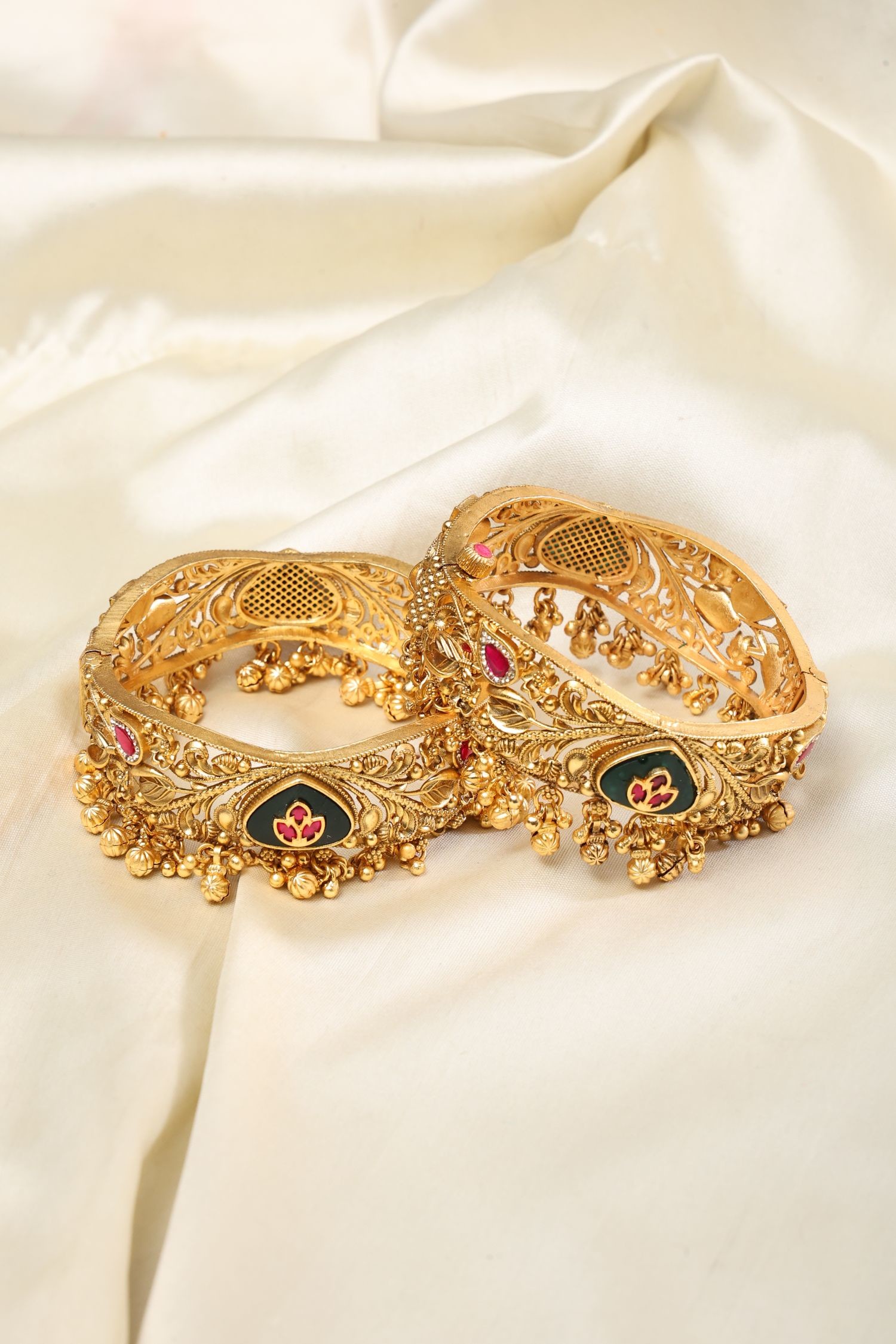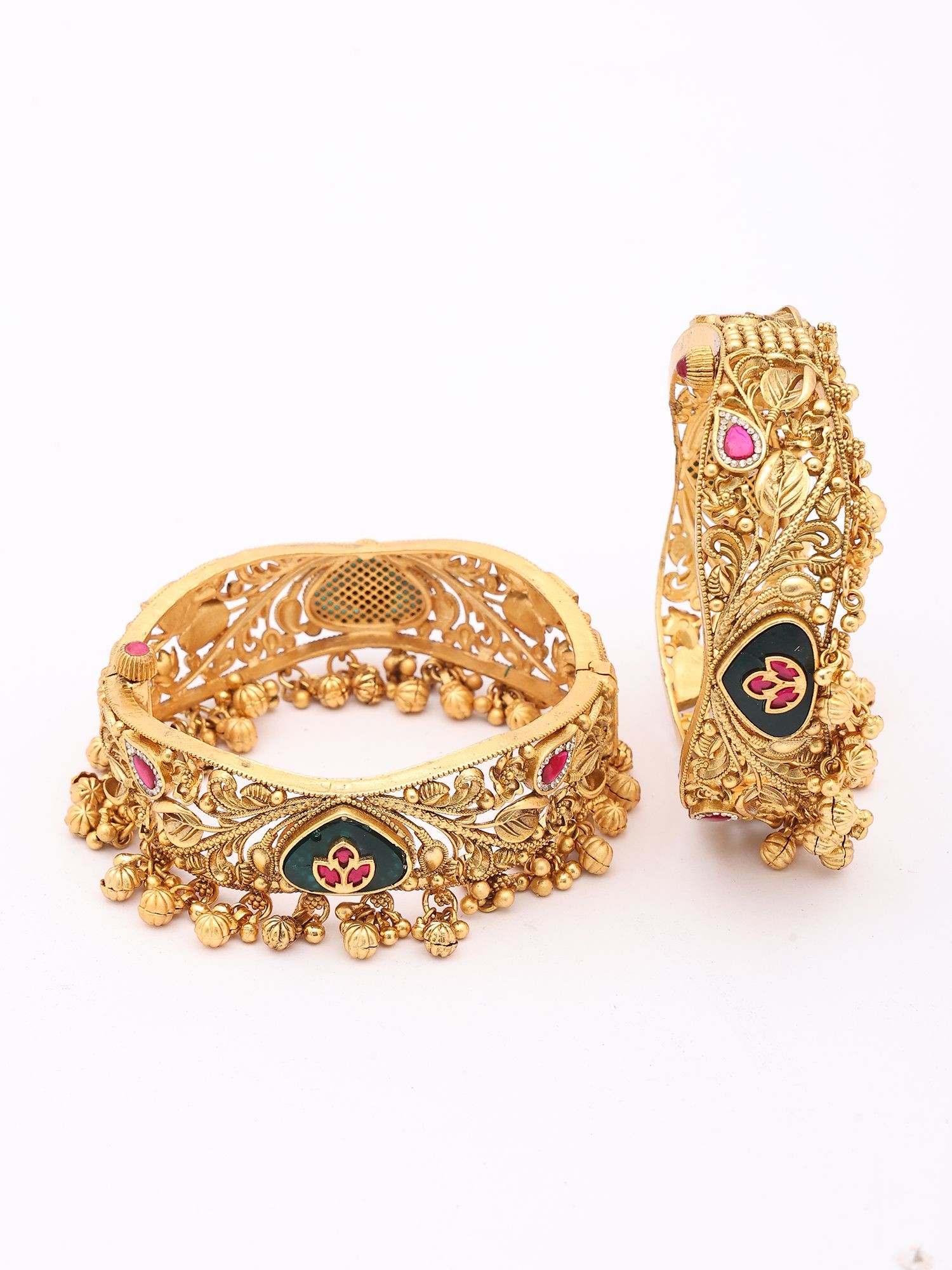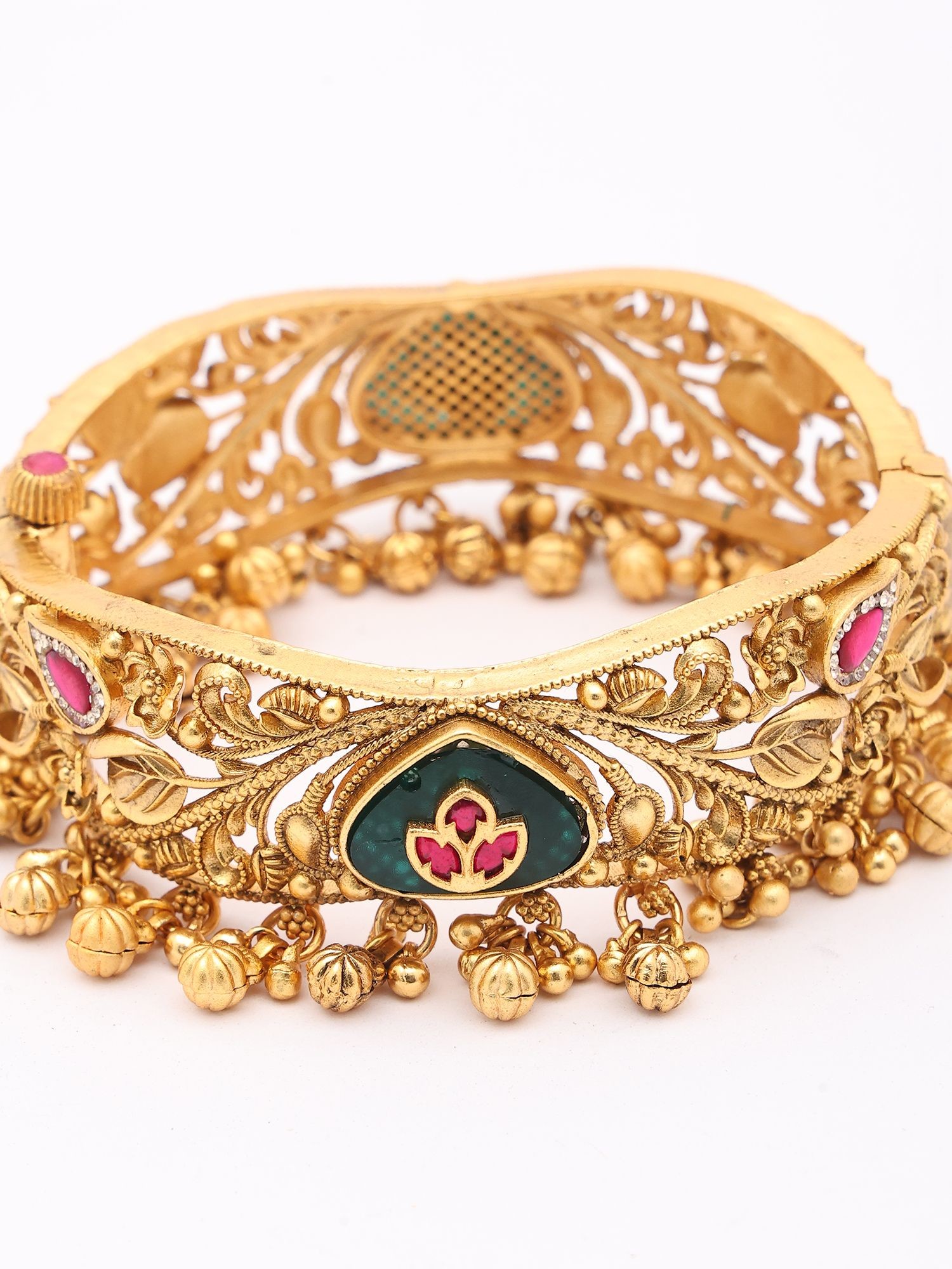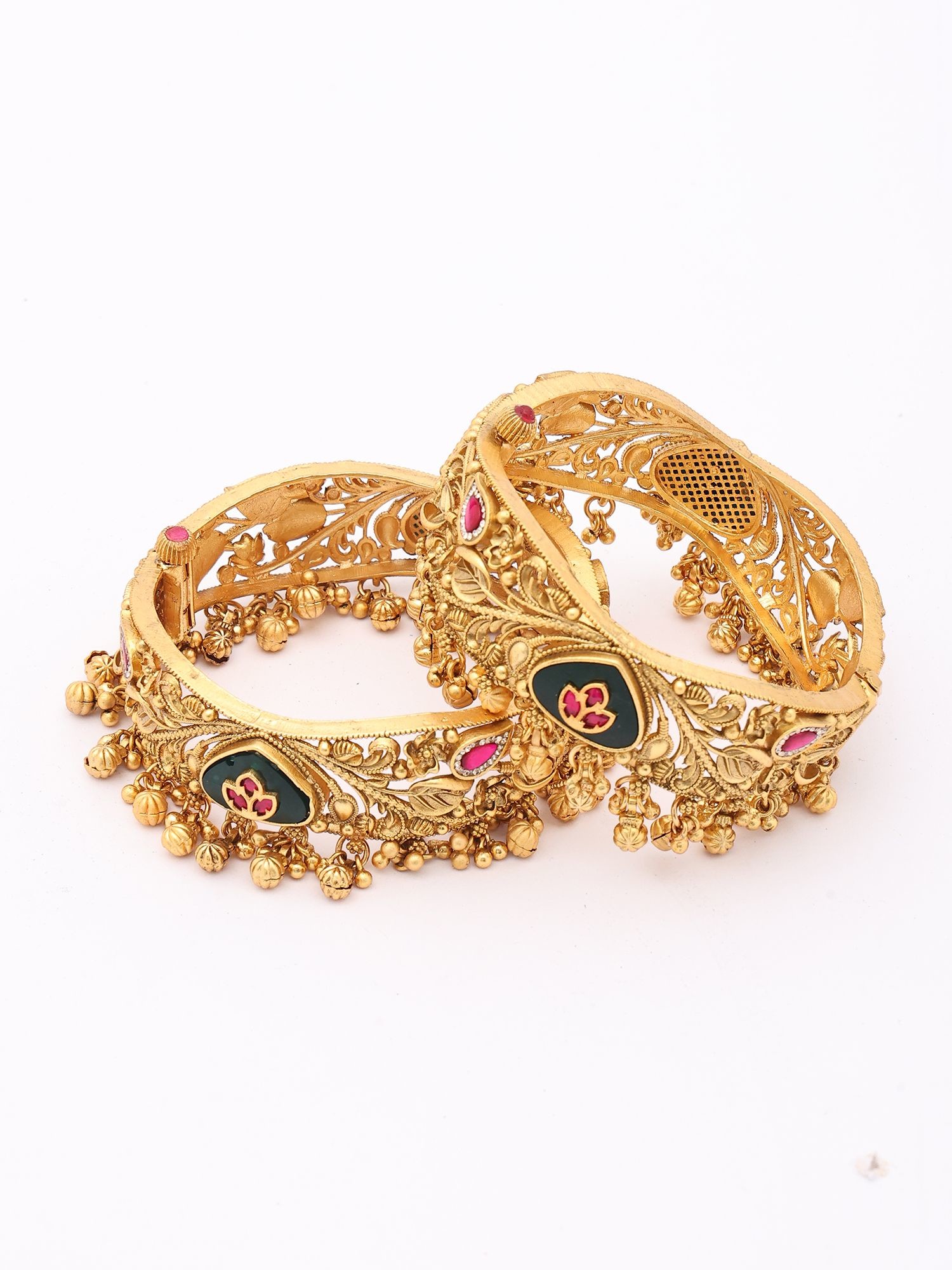 Temple Style Meenakari Kundan Openable Bangle with Ghungroo Drops (Pair)