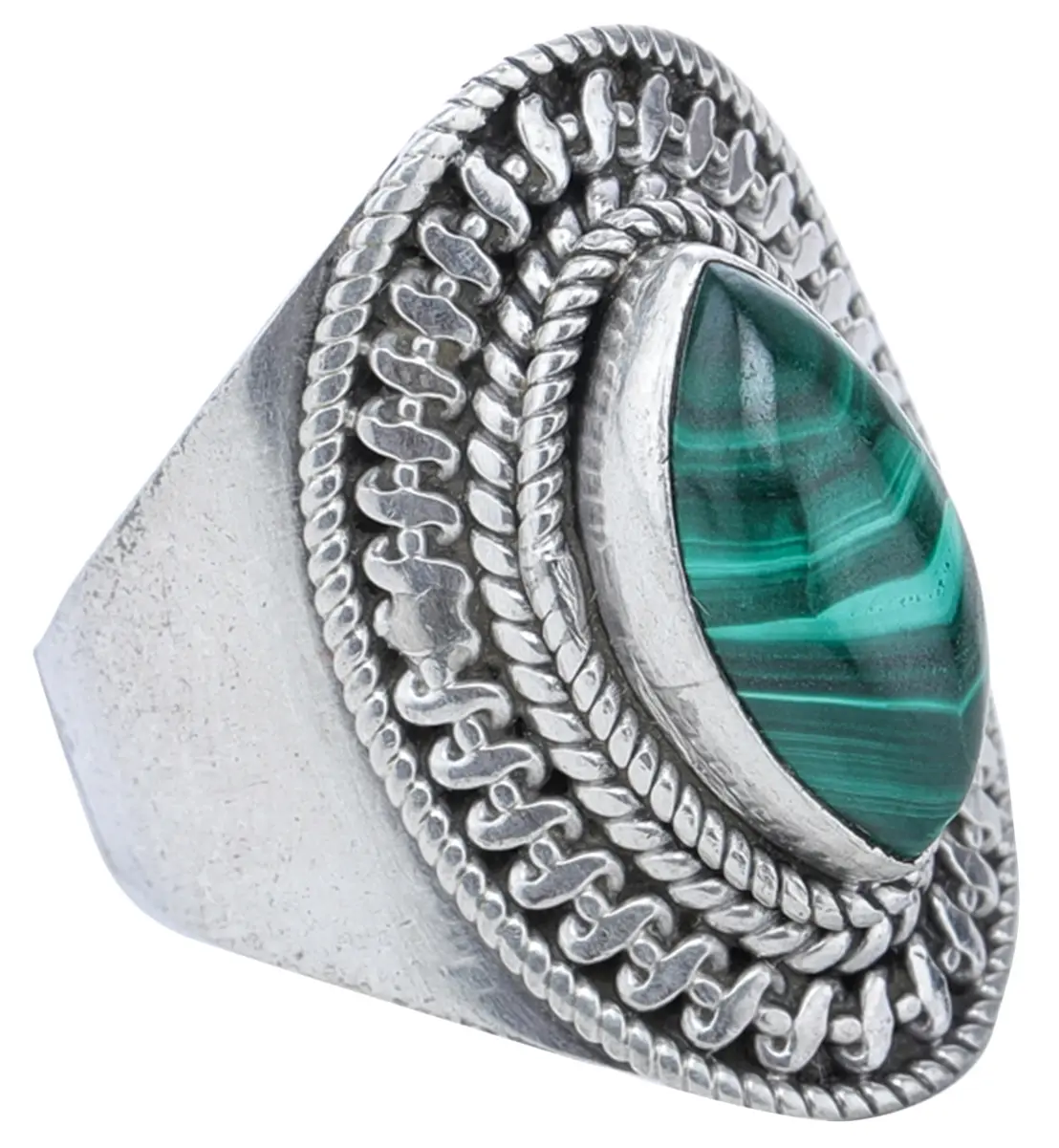 Malachite has long been associated with healing, transformation, and growth. Its vibrant green color is thought to symbolize new beginnings and abundance. Whether you're drawn to its metaphysical properties or simply captivated by its beauty, this ring is sure to become a cherished addition to your collection. Its distinctive character makes it a perfect complement to both casual and elegant attire. Let this piece serve as a reminder to embrace change, seek growth, and celebrate the beauty that surrounds you.