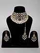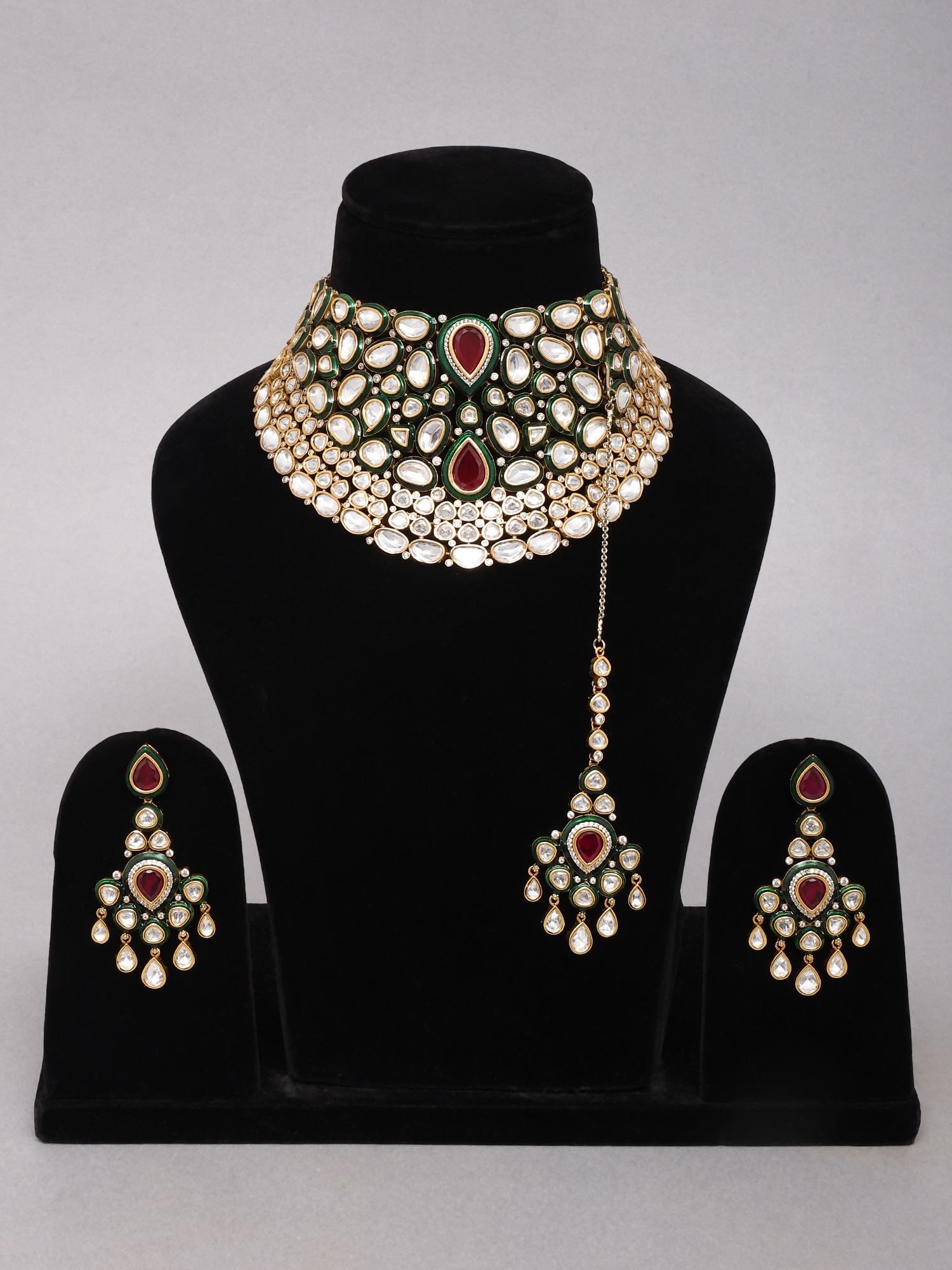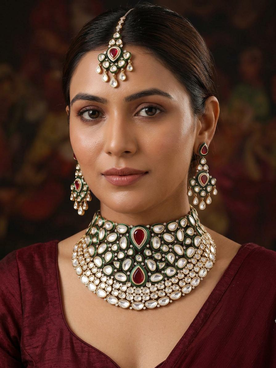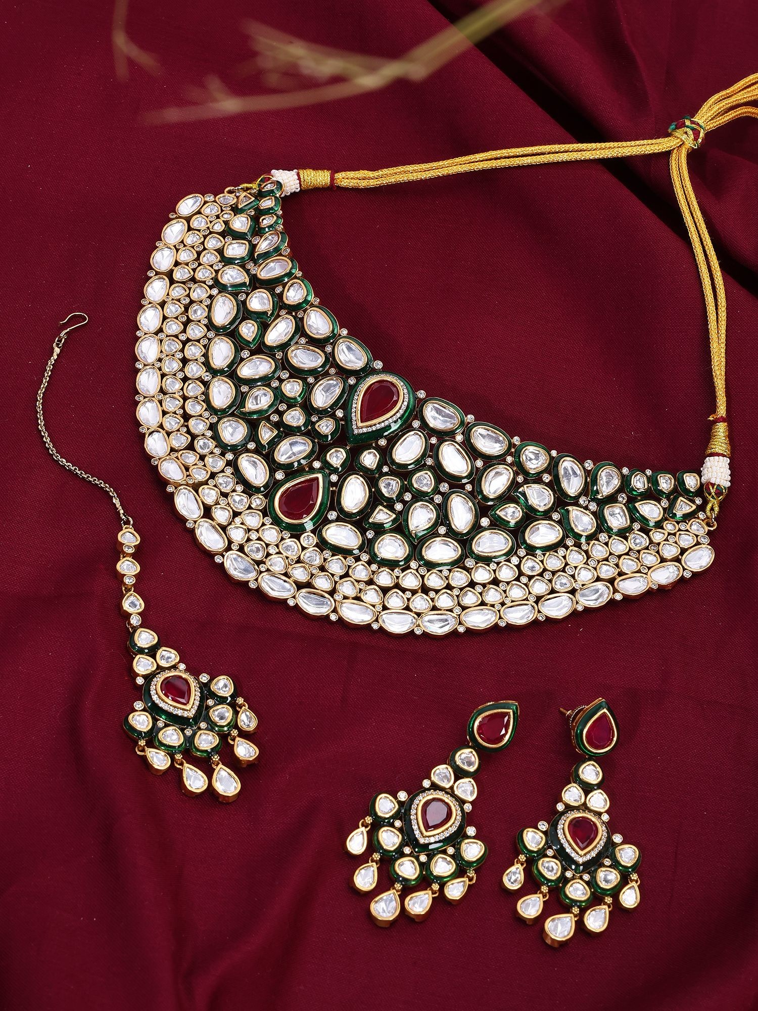 Includes a statement necklace, complementary earrings, and a traditional maang tikka for a complete look.