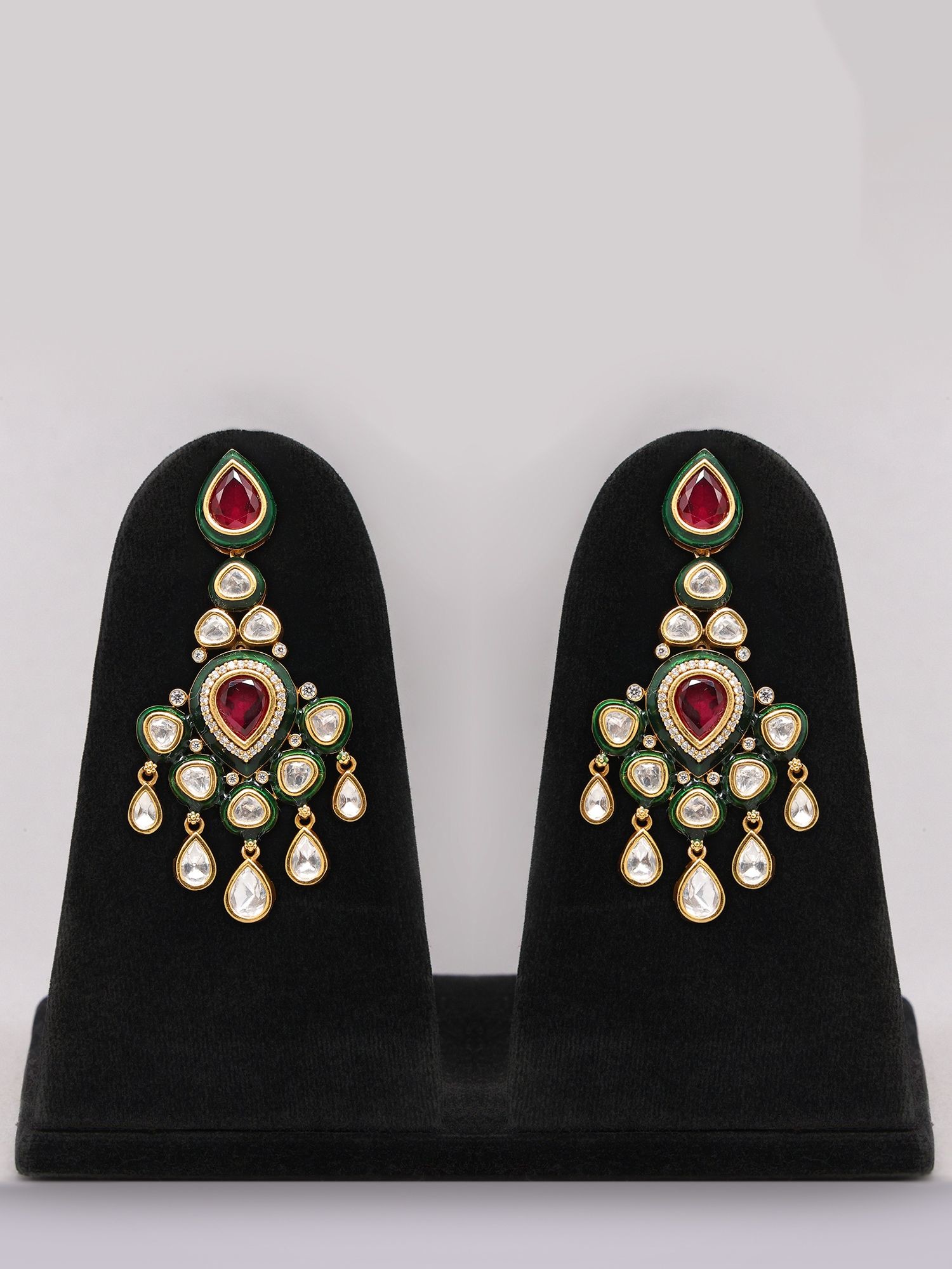 Adorned with deep red accent stones and clear Kundan embellishments that catch the light beautifully.
