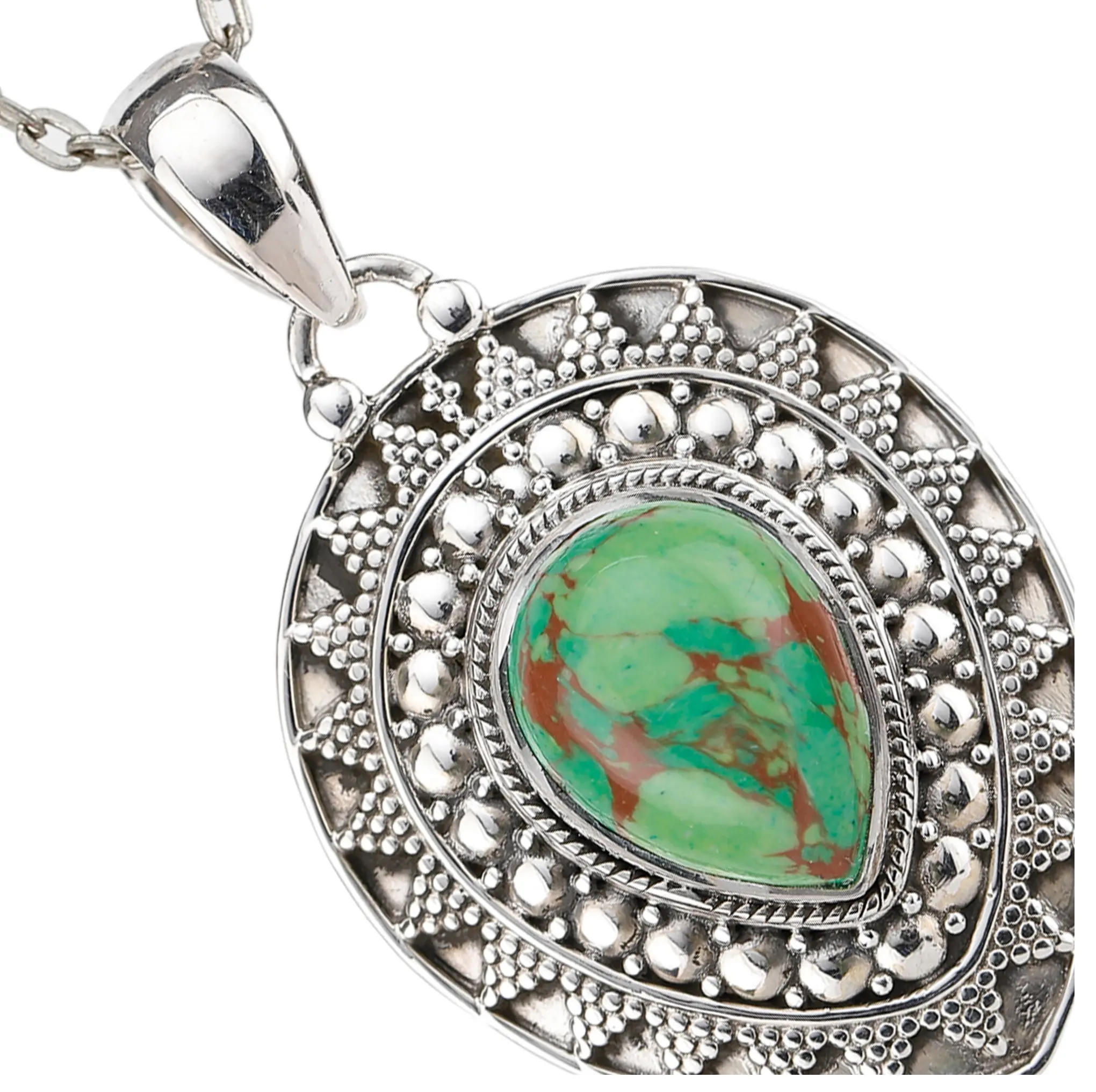 Elevate your jewelry collection with this exquisite pendant, a testament to natural beauty and artisanal craftsmanship. At its heart lies a striking cabochon of Green Mohave Turquoise, a gem prized for its vibrant, earthy tones. The unique matrix of this particular turquoise, with its intriguing reddish-brown veining against a serene green backdrop, creates a captivating visual texture that speaks of ancient landscapes and desert skies. Each inclusion tells a story, making this pendant a truly one-of-a-kind piece.