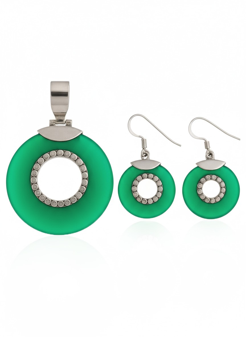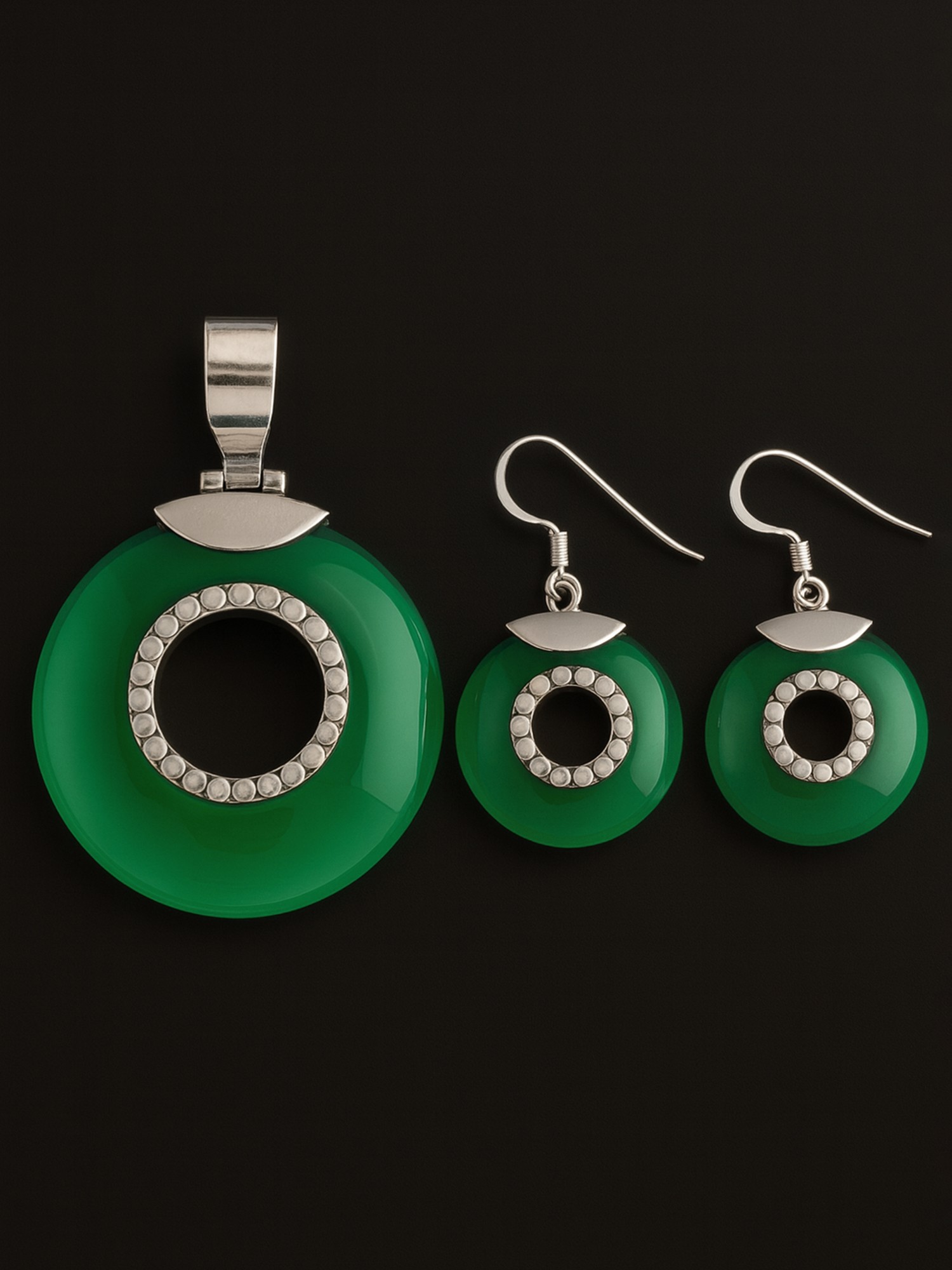 Discover a captivating ensemble that blends the earthy allure of genuine green onyx with the timeless sophistication of sterling silver. This exquisite set, featuring a statement pendant and a pair of matching drop earrings, is designed to add a touch of polished color and refined style to any jewelry collection. Each piece showcases a smooth, perfectly polished round green onyx stone, radiating a rich, translucent hue that speaks of natural beauty and tranquility. The vibrant green is reminiscent of lush landscapes and signifies renewal and growth, making this set a meaningful addition to your personal adornments.