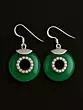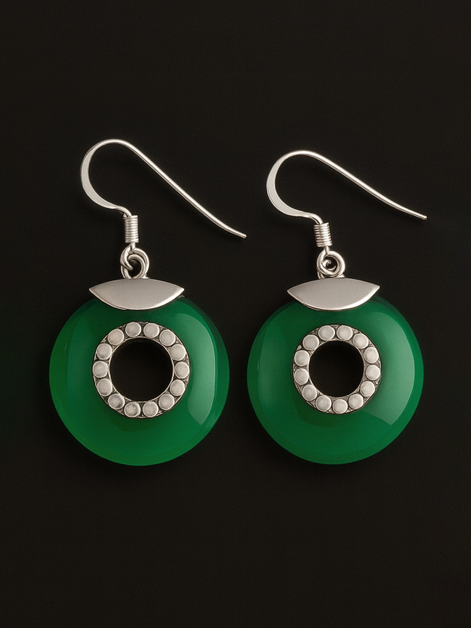 The true artistry of this set lies in the seamless integration of the radiant green onyx with the gleaming sterling silver. The pendant is suspended from a sturdy yet elegant bail, crafted from polished sterling silver, ensuring durability and a comfortable fit. Encircling the central green onyx stone is a delicate, textured sterling silver frame. This inner border, composed of tiny, precisely placed silver beads, creates a subtle yet striking contrast, highlighting the vibrant green of the onyx and adding a dimension of intricate detail. This same thoughtful design is replicated in the matching earrings. Each earring features a round green onyx cabochon, framed by the same finely detailed silver bead work, and hangs gracefully from a classic sterling silver hook. The hook design ensures ease of wear and a secure fit, allowing the earrings to sway gently with every movement.
