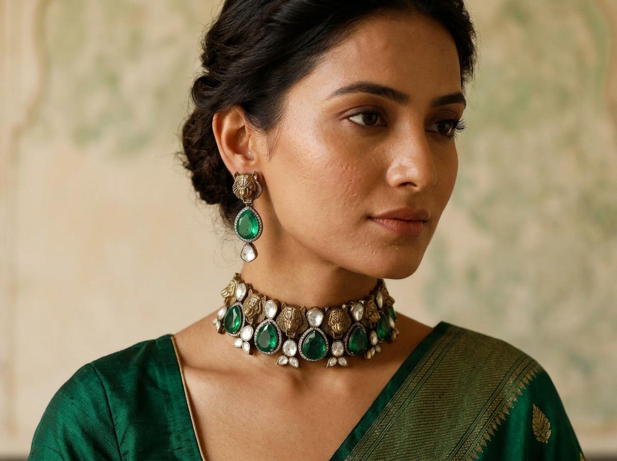 Stone Studded Moissanite Kundan Embellished Necklace With Matching Earrings
