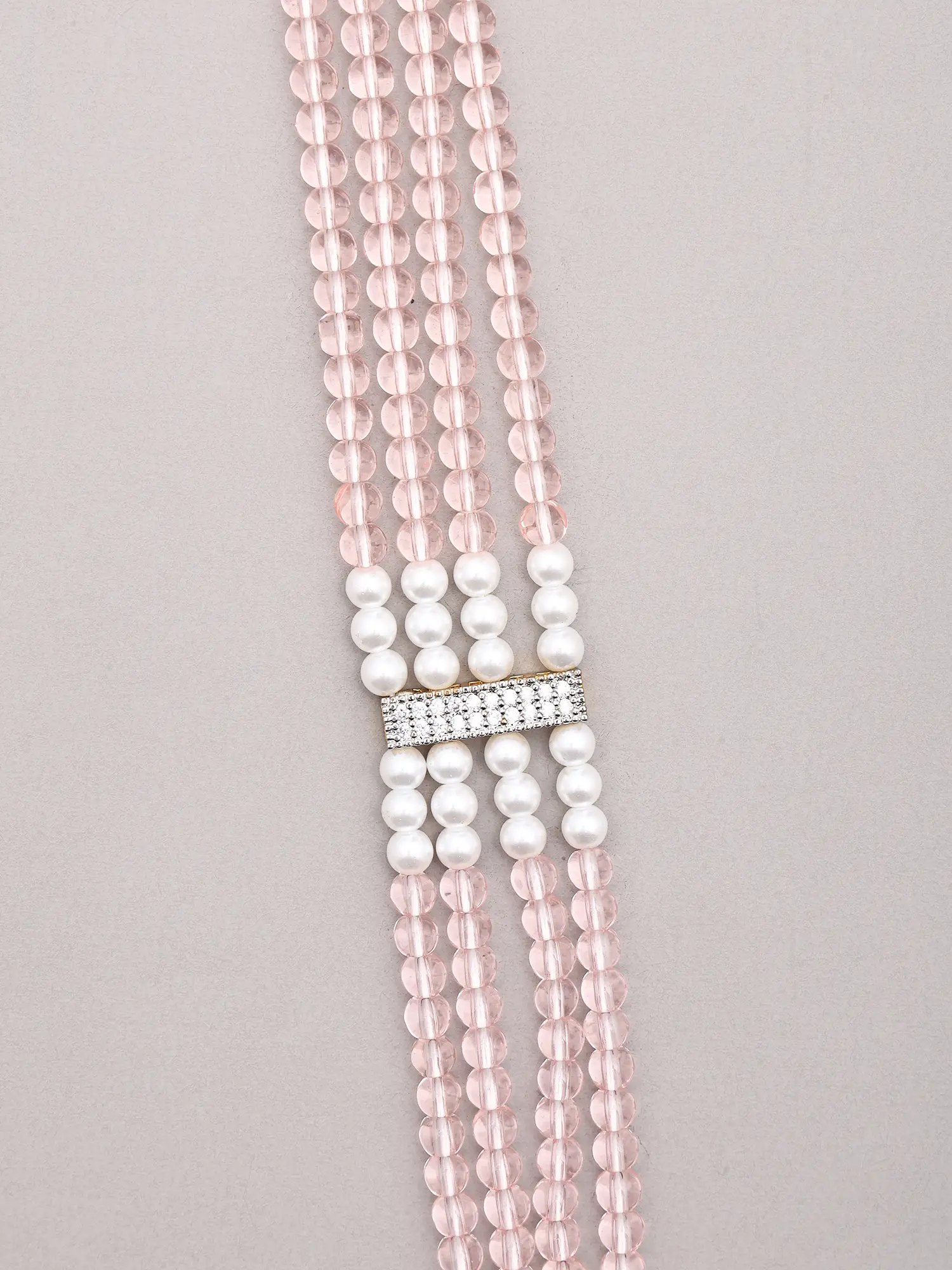 The necklace itself is a testament to intricate craftsmanship. Four strands of shimmering, rose-tinted crystal beads gently cascade down, interspersed with lustrous pearls. These strands converge at a triangular gold-toned fitting, which leads to the breathtaking floral pendant. The subtle yet striking blush hue of the beads adds a touch of romantic charm, making this piece perfect for adding a soft, sophisticated accent to any ensemble. The adjustable chain ensures a comfortable and customizable fit, allowing you to wear it at your preferred length.