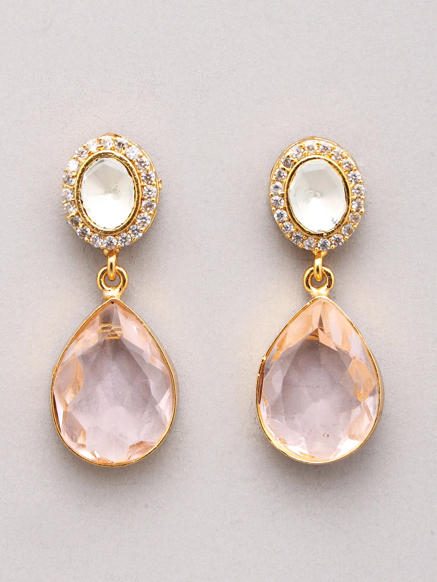 Completing this stunning set are a pair of matching earrings. Each earring mirrors the delicate beauty of the necklace's design. A small, oval kundankari stud anchors the earring, from which hangs a teardrop-shaped blush crystal. This elegant drop design complements the floral motif of the necklace, creating a cohesive and harmonious look. The earrings are designed to sway gently with your movements, catching the light and adding a subtle sparkle to your profile.