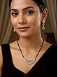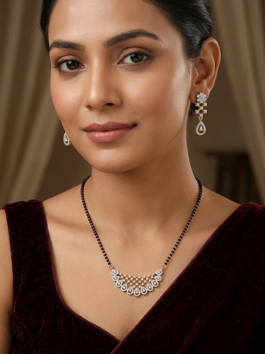Completing this stunning set are the matching earrings. Echoing the design elements of the mangalsutra pendant, these earrings are delicate and refined, adding a touch of elegance to your overall look. The design ensures they are comfortable to wear, allowing you to showcase your style with ease. Whether worn together with the mangalsutra or individually, these earrings are versatile enough to complement a range of outfits and occasions.