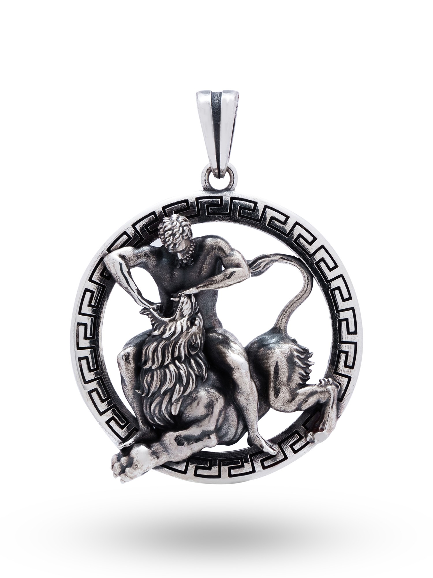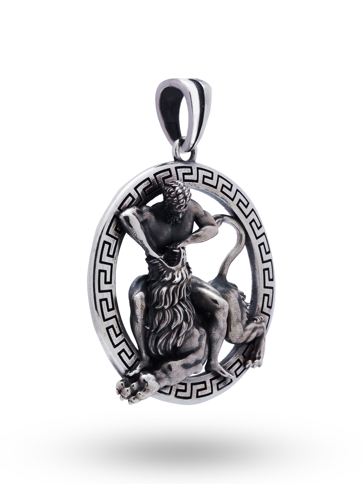 Meticulously crafted, this pendant showcases an intricate depiction of the iconic battle. The attention to detail brings the scene to life. The powerful musculature of the hero, the ferocity of the beast, and the surrounding Greek key design are all rendered with exceptional clarity. The pendant is made from gleaming, high-quality sterling silver. Its polished finish enhances the details of the design and ensures a lasting shine.