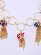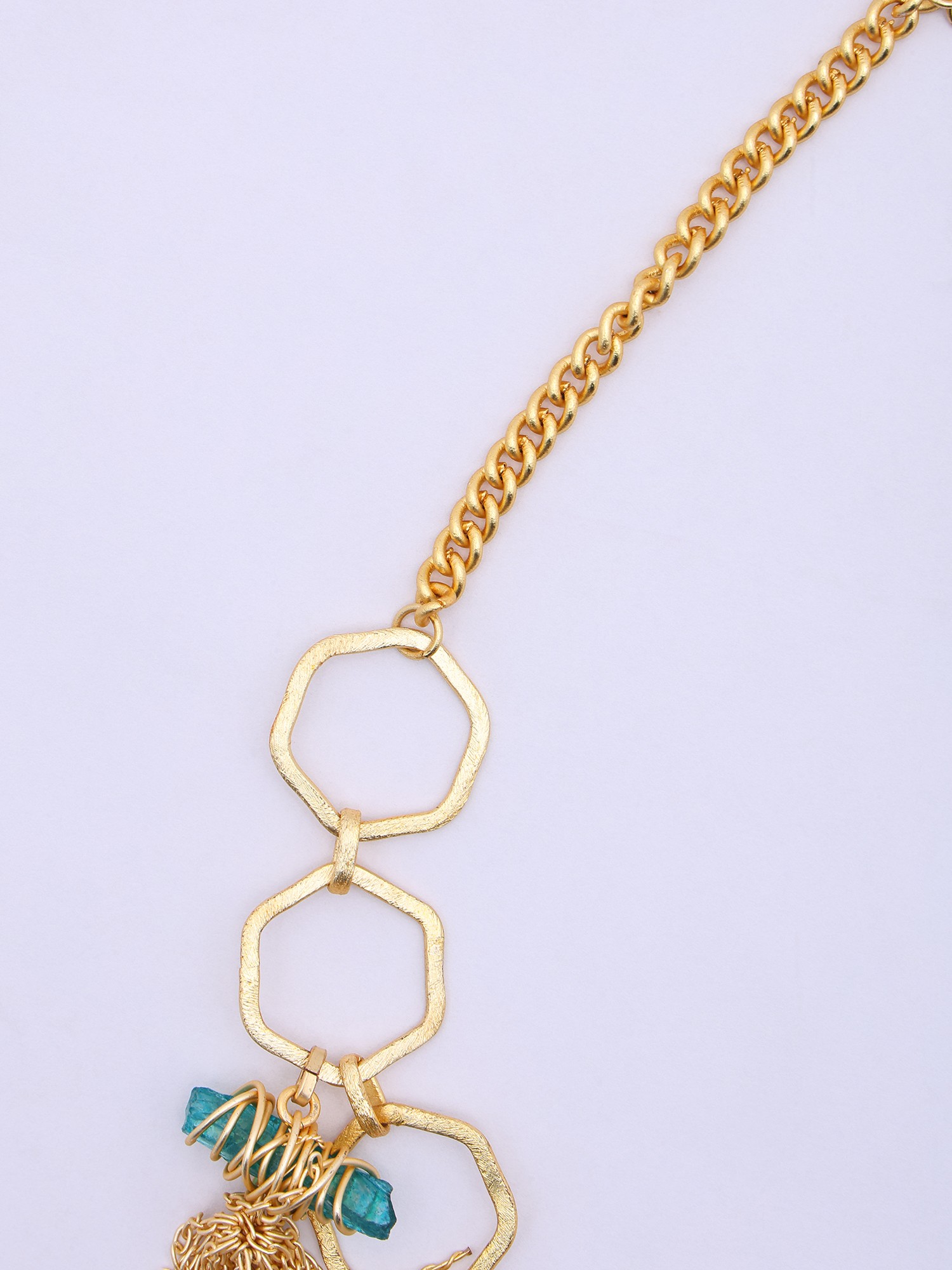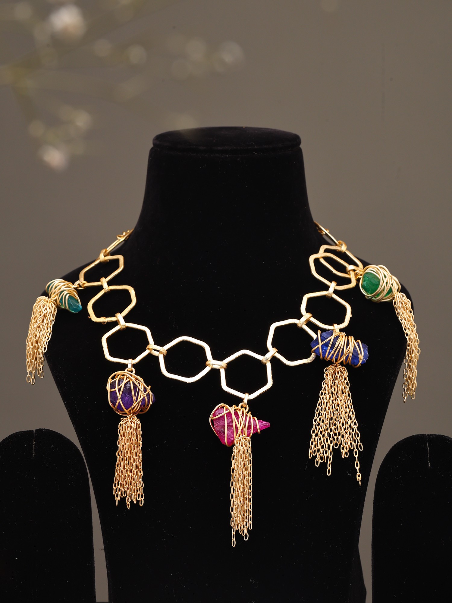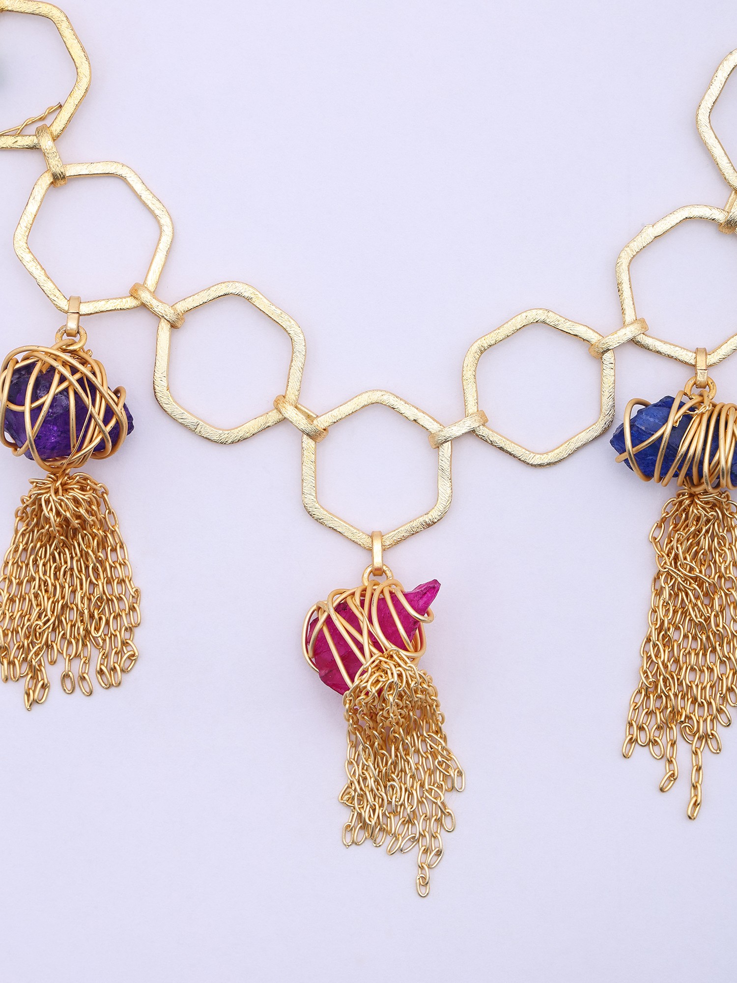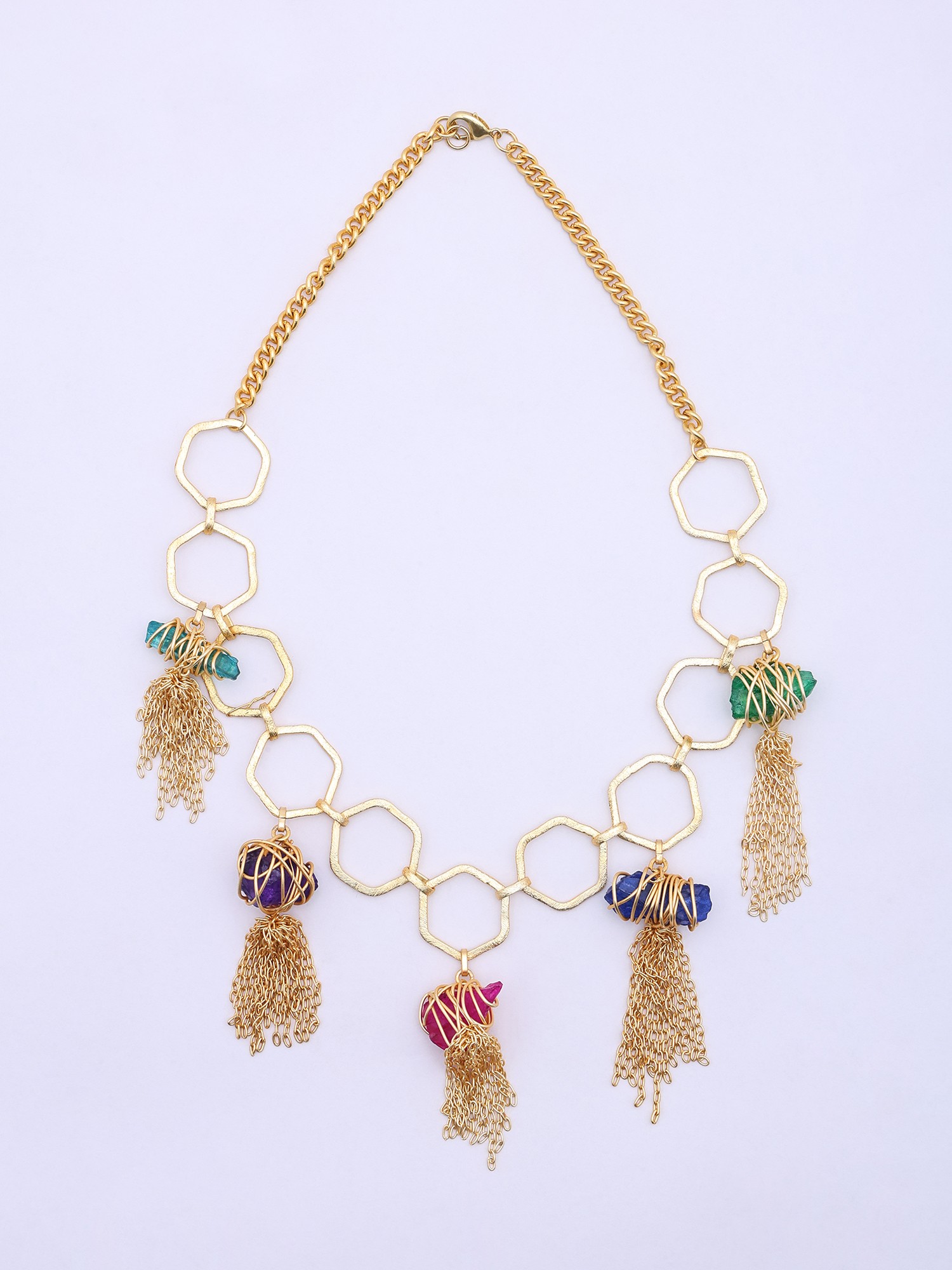 Hexagonal Link Necklace with Multicolour Stone and Chain Tassels