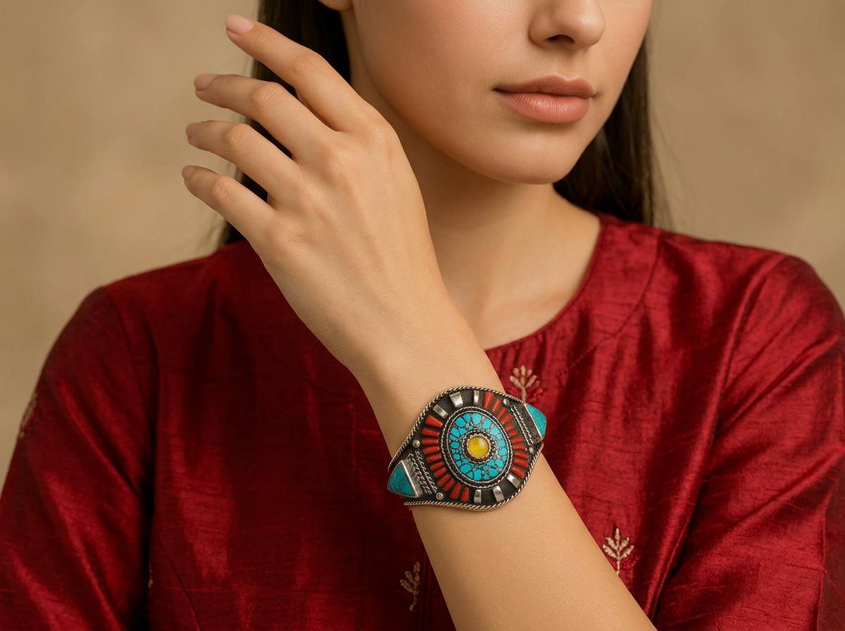 This bracelet is incredibly versatile, seamlessly complementing a wide range of styles and outfits. Dress it up with an elegant evening gown for a touch of bohemian glamour, or pair it with a casual denim jacket and jeans for a more relaxed, eclectic look. Its unique design makes it a conversation starter, a piece that is sure to draw attention and spark curiosity. It is perfect for those who appreciate unique jewelry, those drawn to the vibrant traditions of Tibetan artistry, or simply for adding a pop of color and texture to their personal style. It will make a cherished addition to any jewelry collection, and is suitable for gifting too.