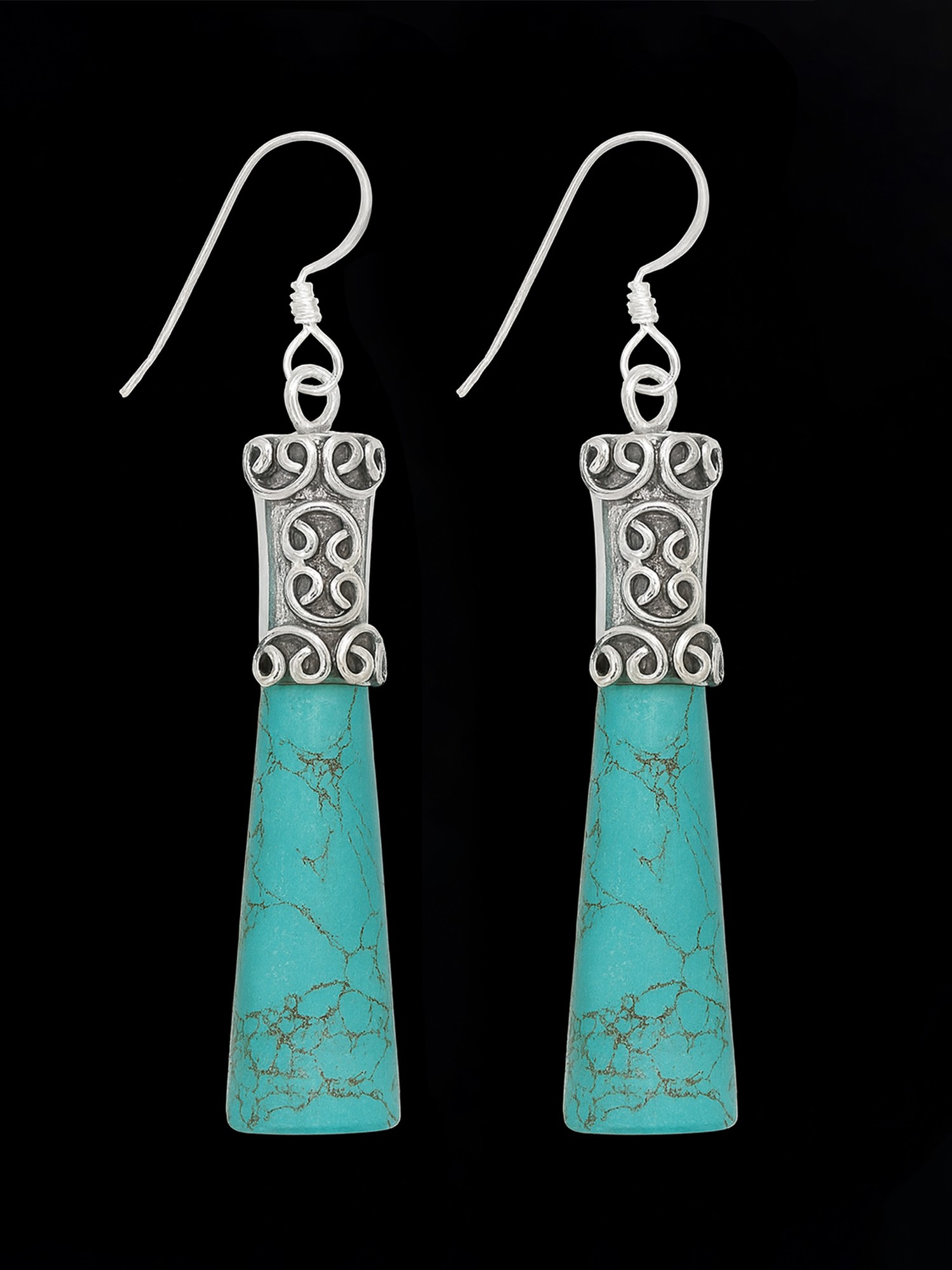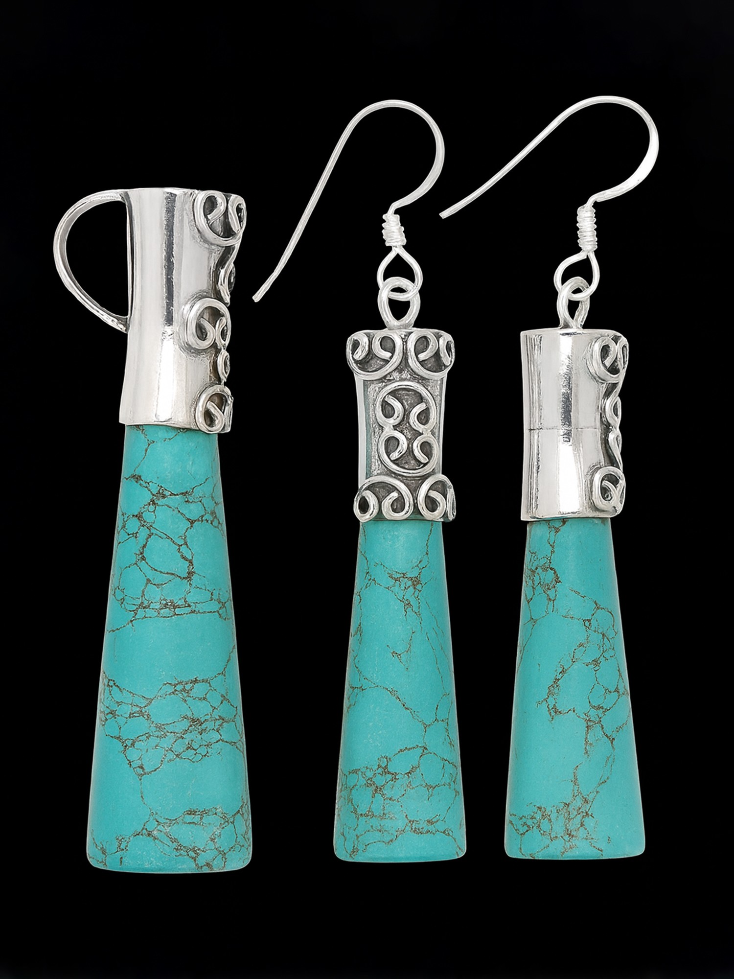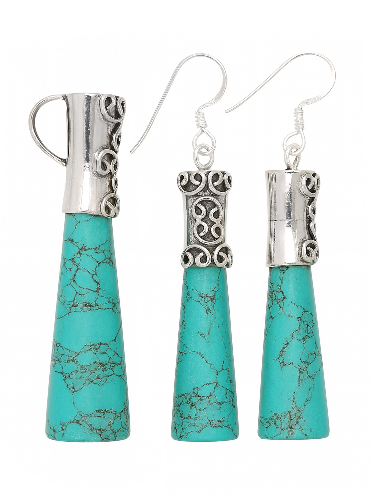 Discover a captivating ensemble that effortlessly blends earthy elegance with artisanal charm. This exquisite set features a striking pendant and a pair of perfectly matched dangle earrings, each crafted to be a statement piece. The focal point of this collection is the vibrant, turquoise-colored stone, meticulously cut into a tapered "pencil" shape. Its mesmerizing matrix of dark, web-like inclusions creates a visually stunning contrast against the brilliant cyan hue, evoking the rugged beauty of the American Southwest or the alluring depths of a tropical ocean.