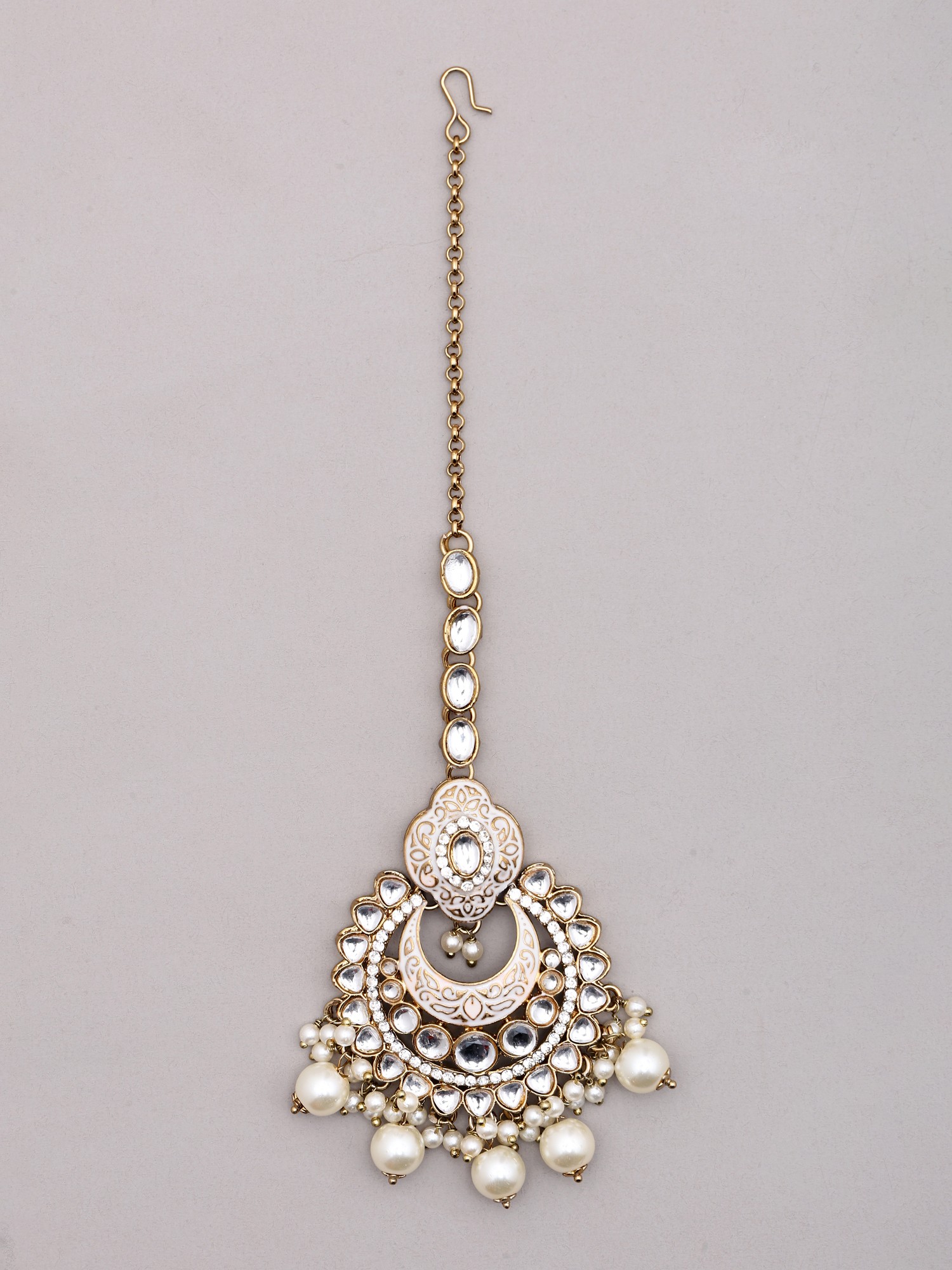 Stone Studded Pearl Drop Necklace Set with Earrings and Mangtika