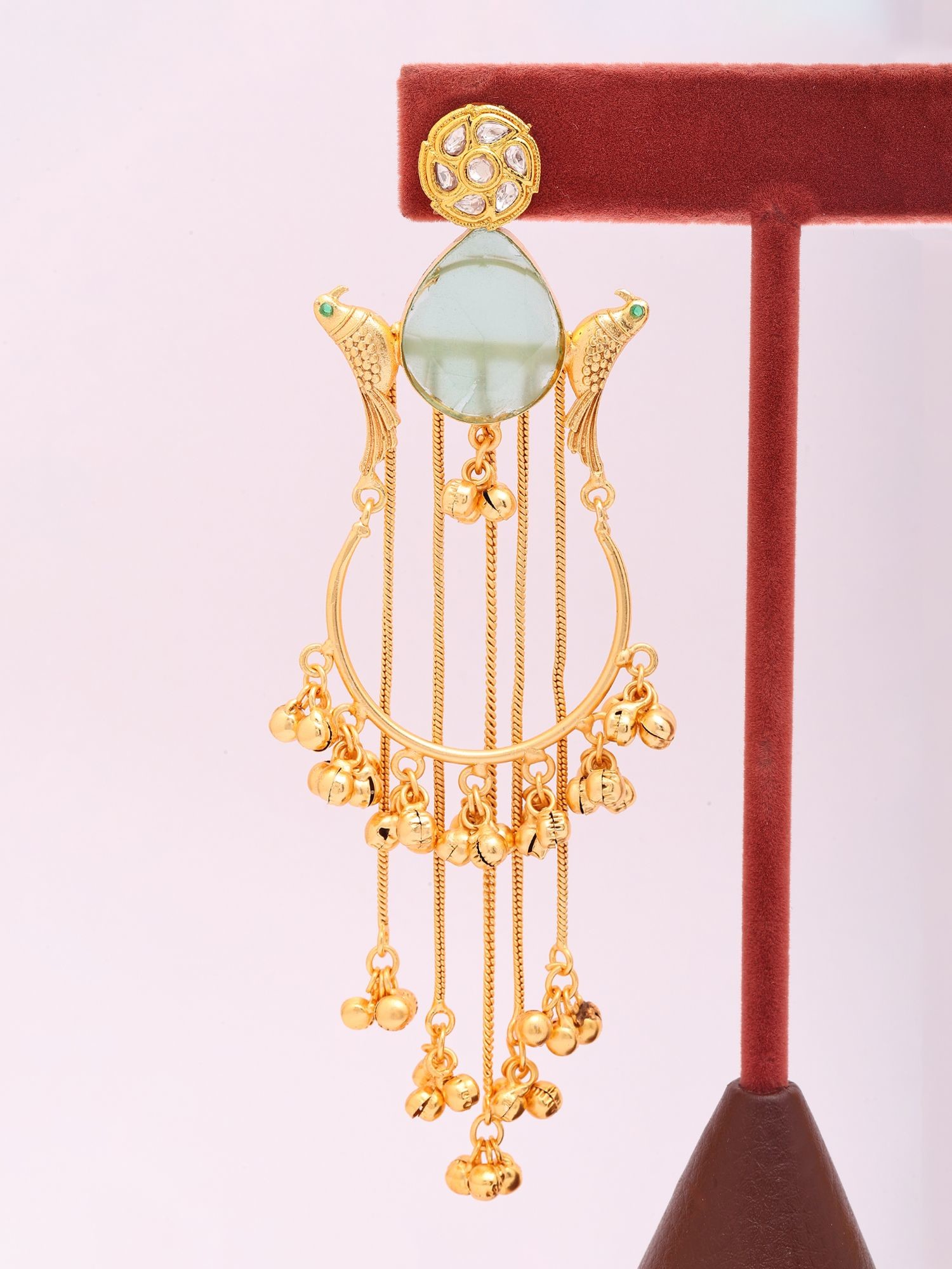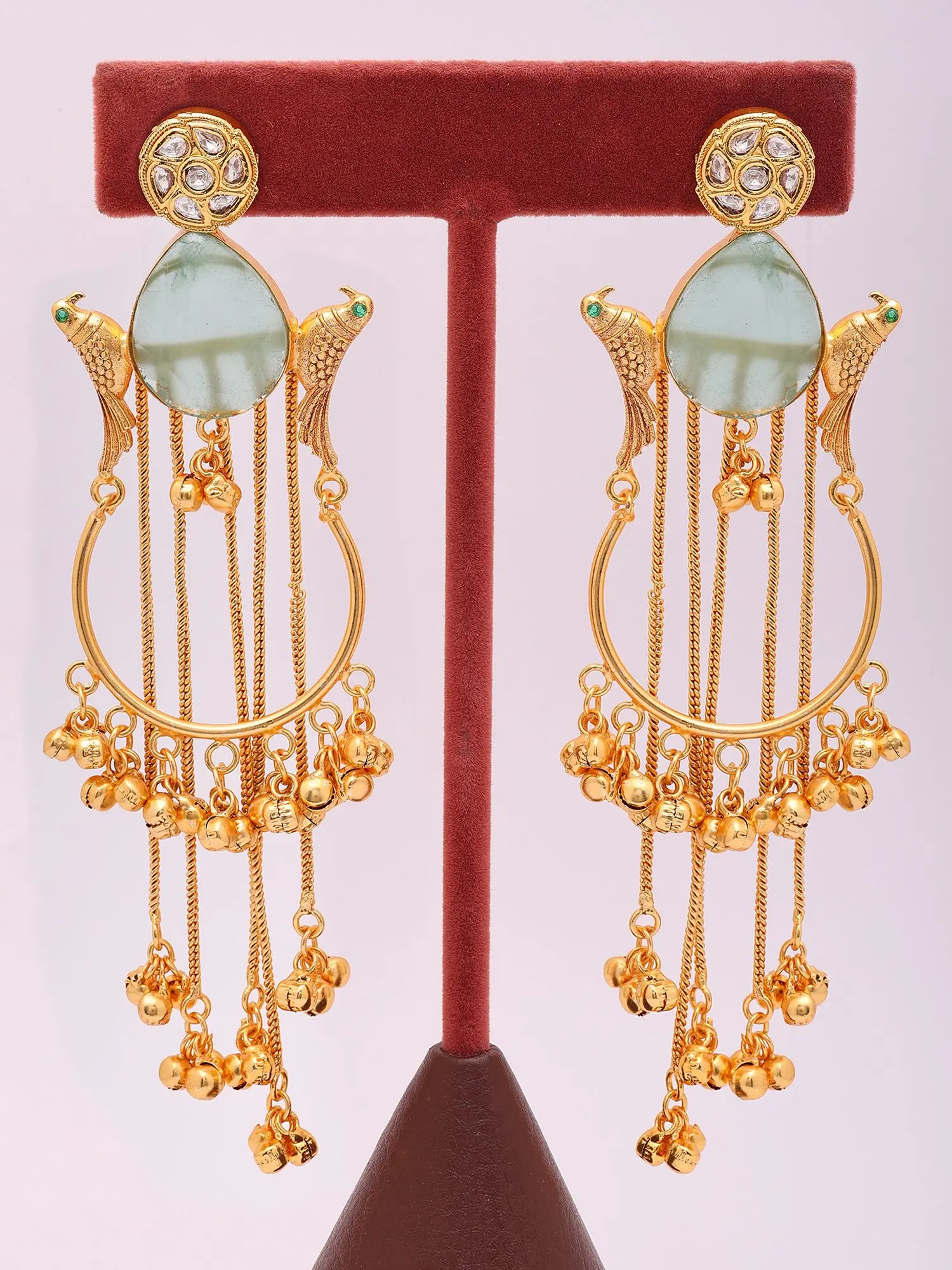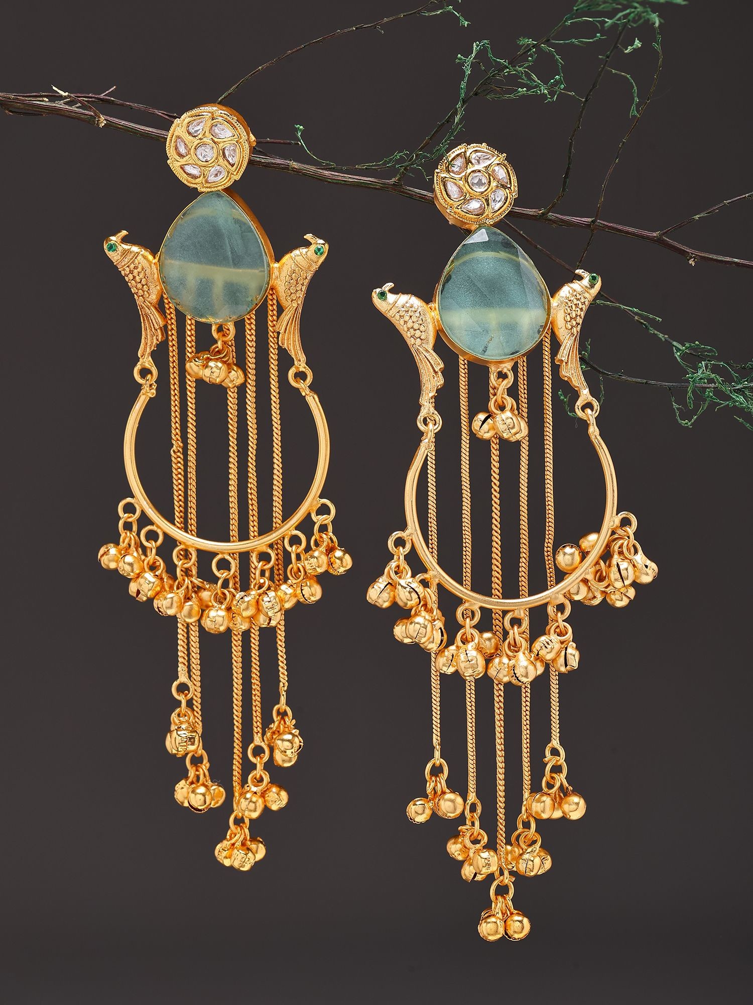 The arresting design features a central, teardrop-shaped stone, its serene hue evoking the tranquil depths of nature. Flanking this are exquisitely rendered golden birds, their forms suggesting flight and freedom, with tiny emerald accents that catch the light. Cascading below, a series of delicate chains are adorned with numerous small, bell-like charms that create a subtle, melodic movement. A circular stud, encrusted with shimmering stones, crowns each piece, adding a final touch of refined sparkle.