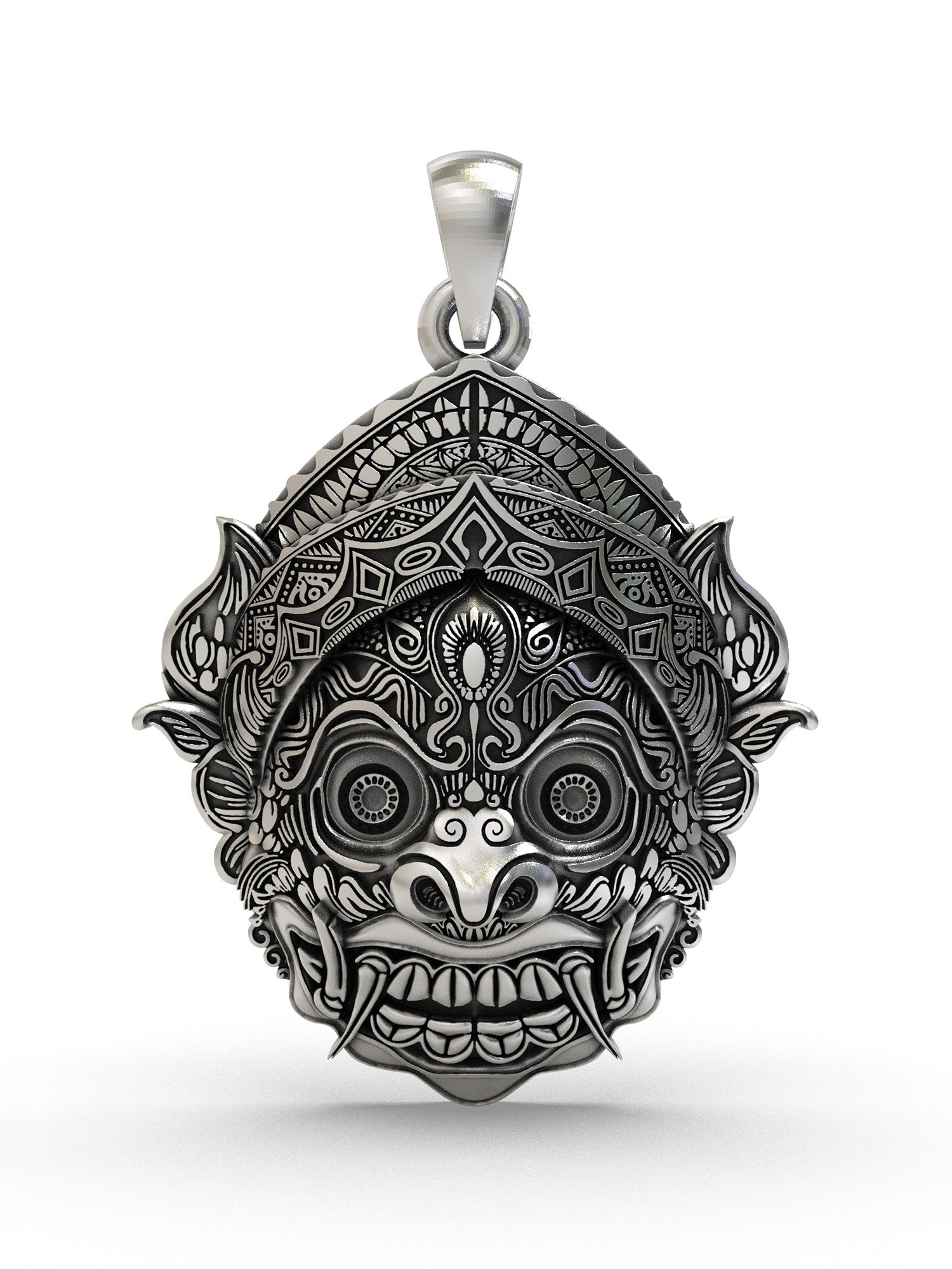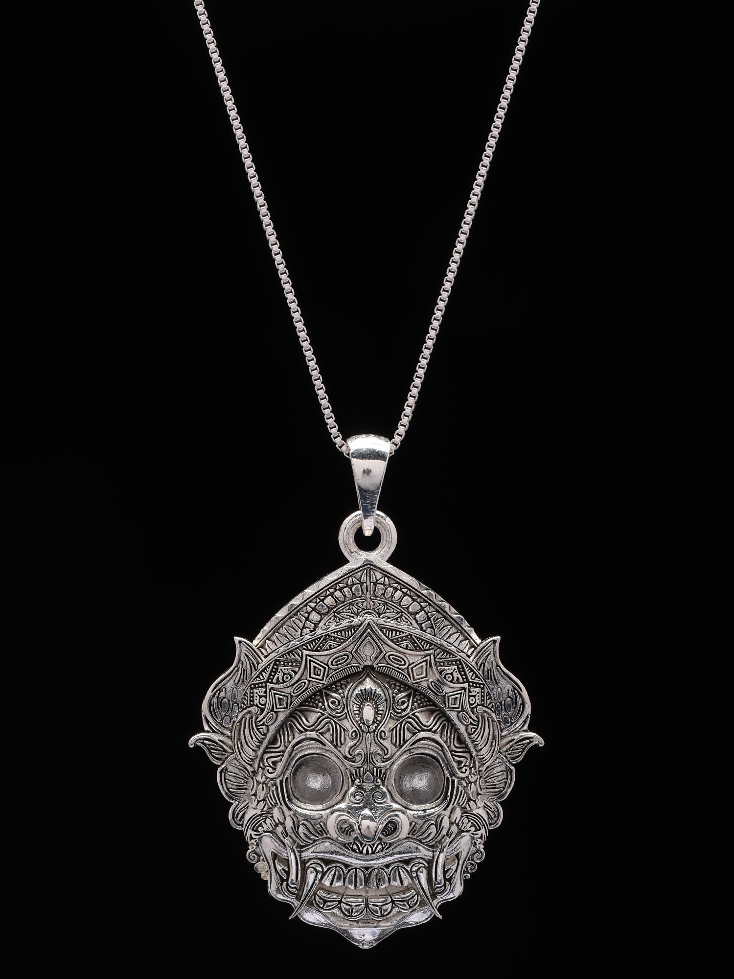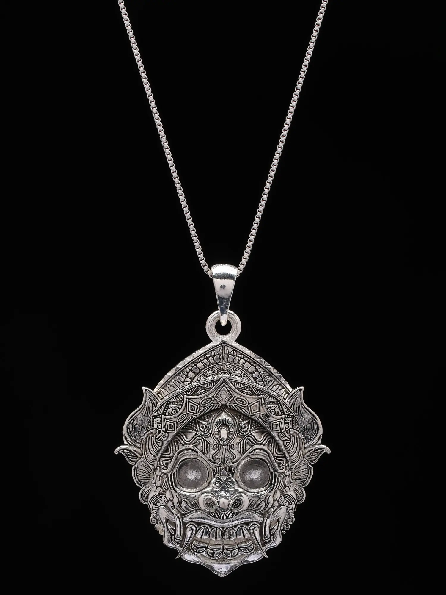 This unique pendant features the formidable Kirtimukha, a symbol rich in mythology and artistry. The intricate detailing, brought to life in shimmering sterling silver, captures the essence of this powerful figure. Wear it as a bold statement piece or as a meaningful representation of protection and strength.