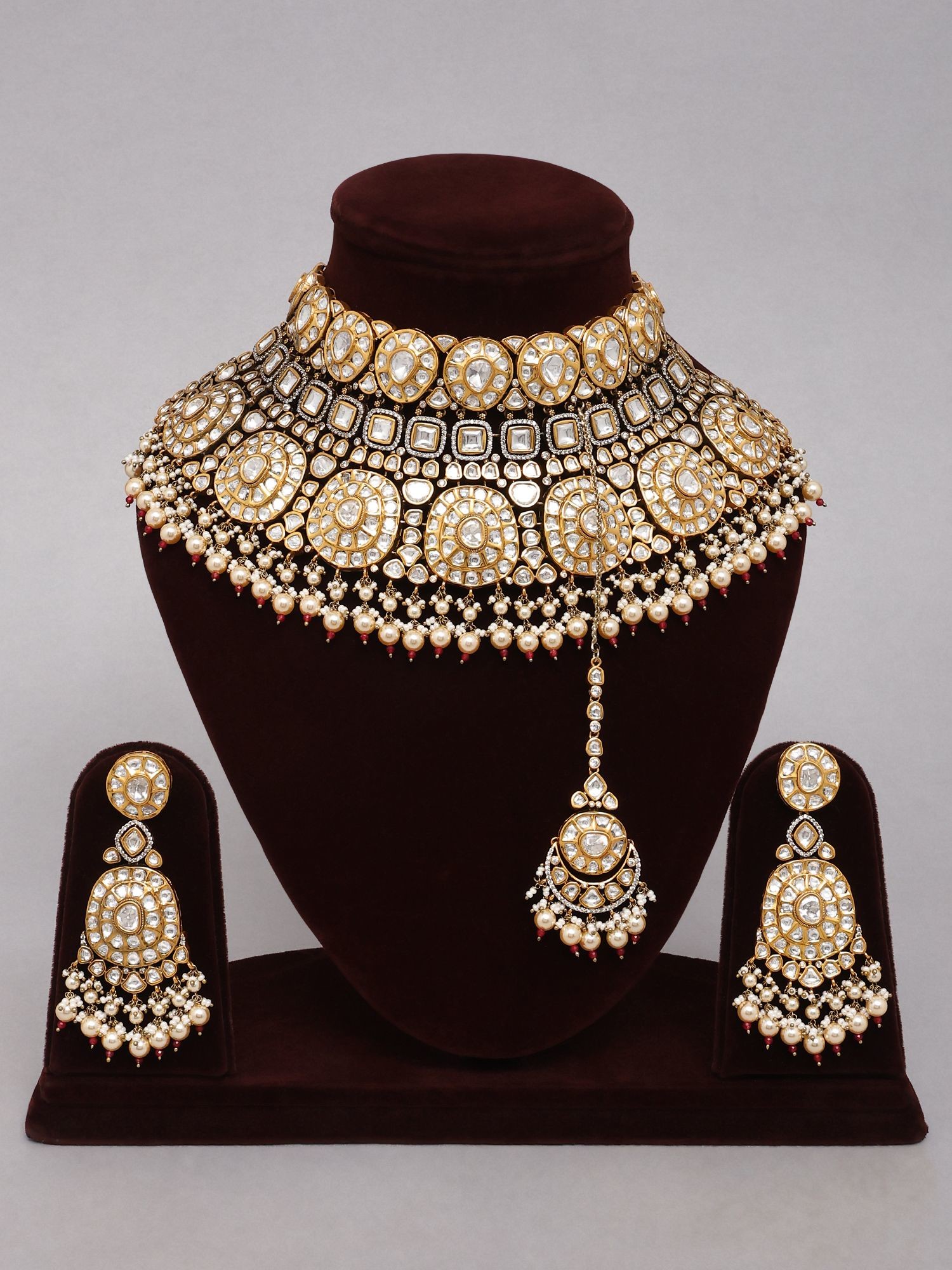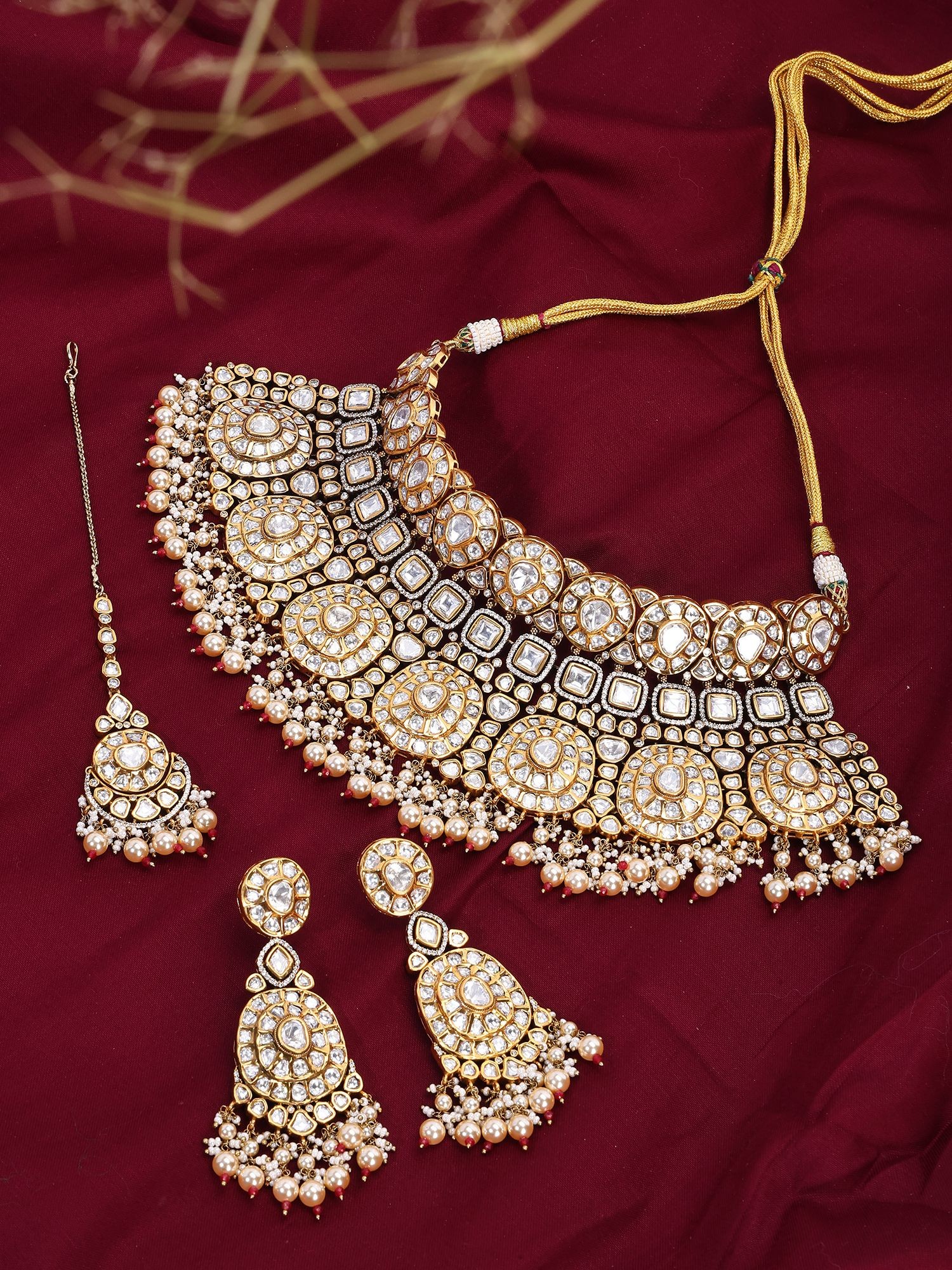 • Complete three-piece set including a statement choker, dangling earrings, and a maang tikka.